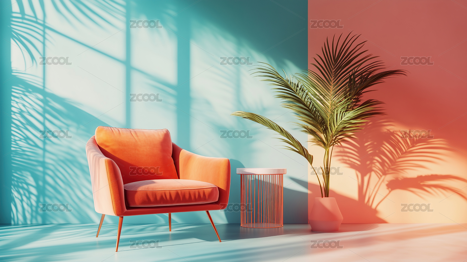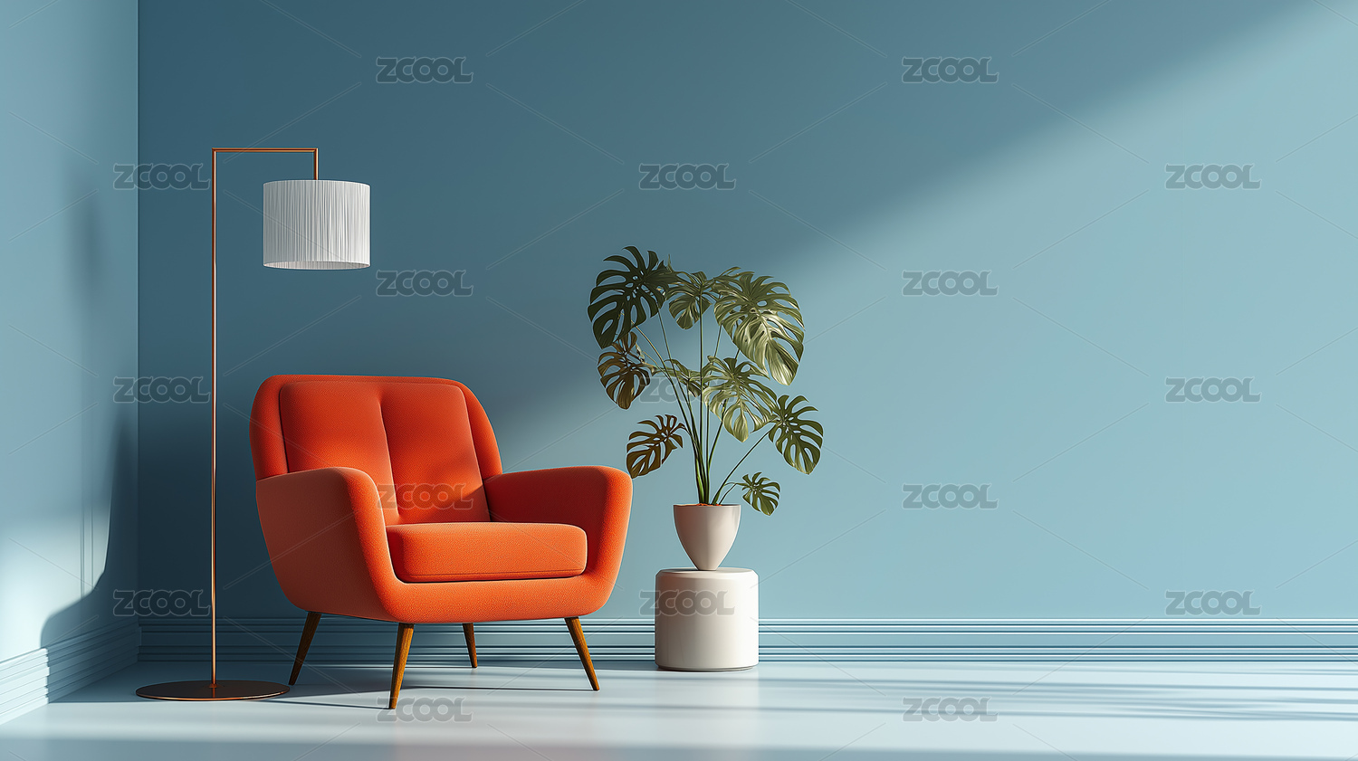 蓝墙前橙沙发配灯与桌插绿植摆件