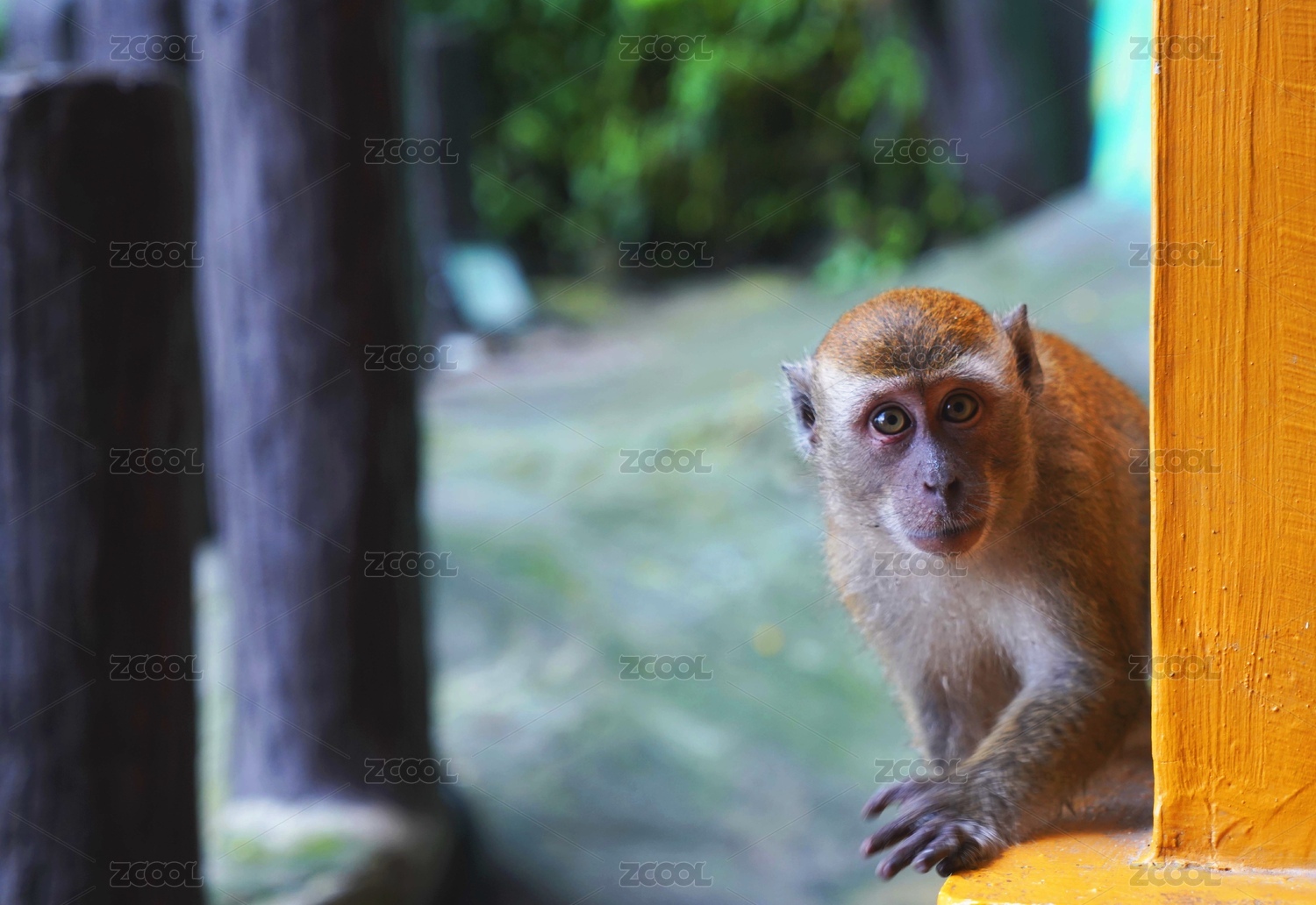 中国湖北武当山一只手扶栏杆露出笑脸的猕猴