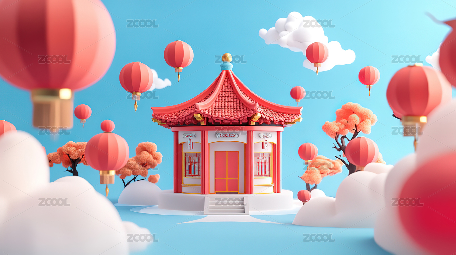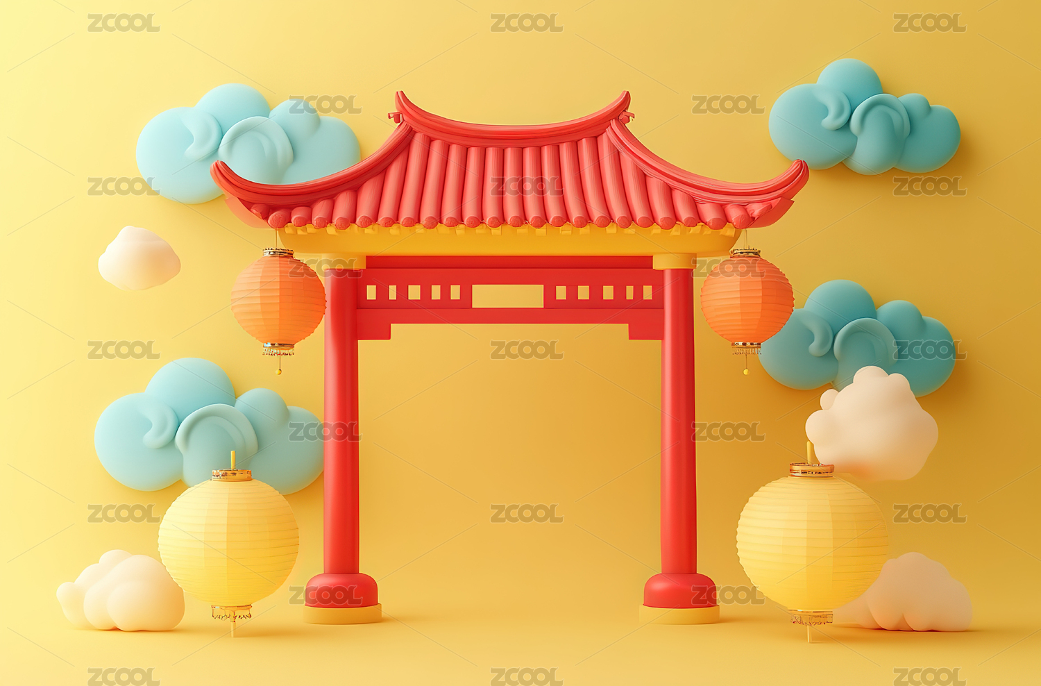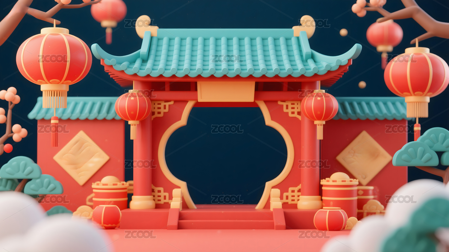 设计,插画,装饰,3D,传统,春节,大门,灯笼,建筑,开门红