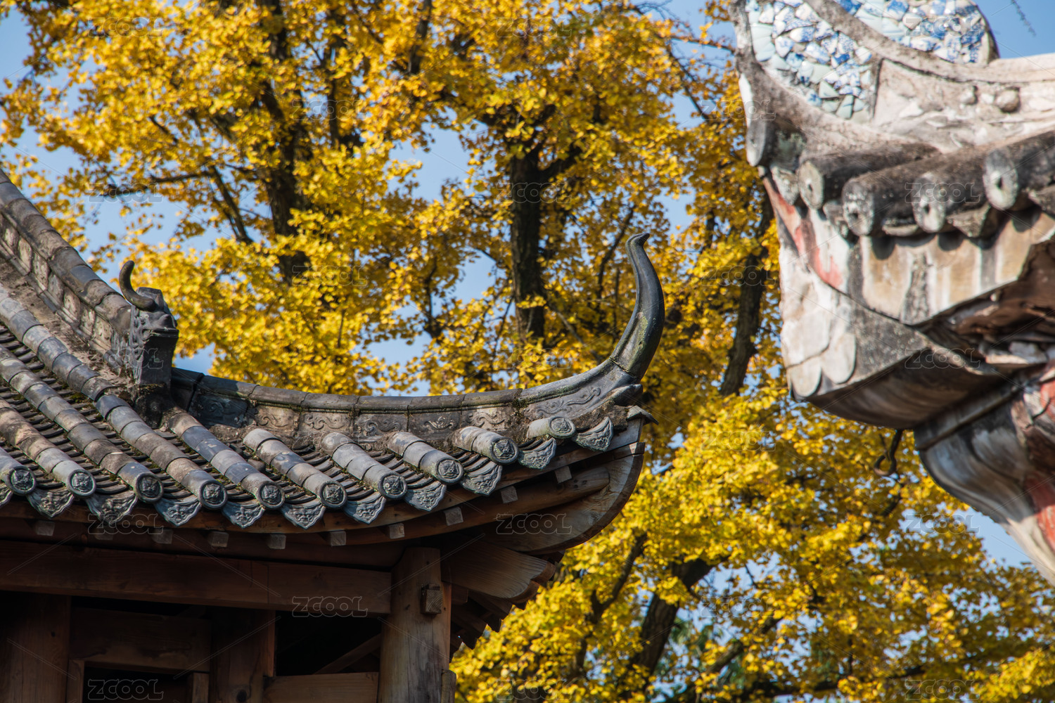 中国四川省成都市文殊院秋季金黄色银杏树下的寺庙古建筑细节图