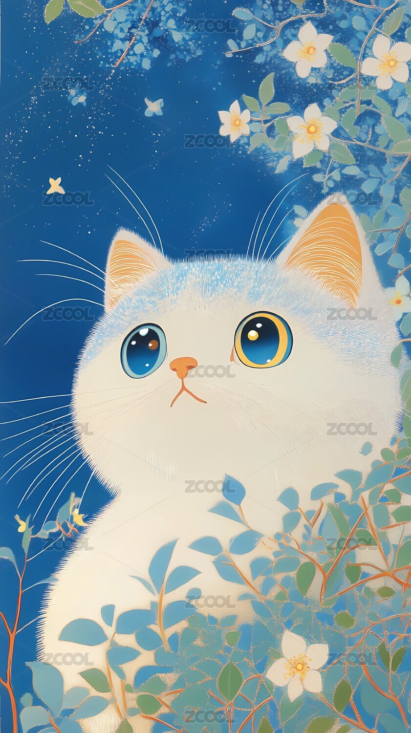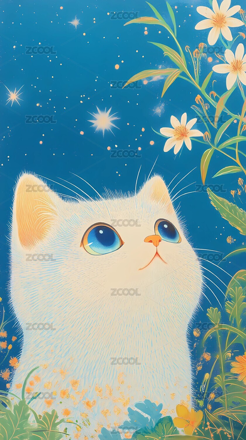 梦幻唯美可爱猫咪小花手机插画壁纸