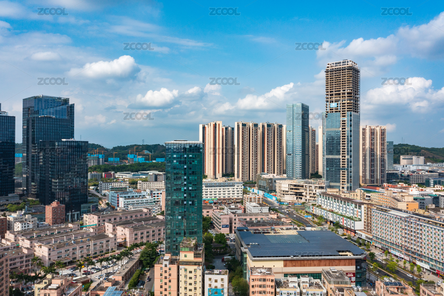 蓝天白云下的中国深圳城市郊区住宅建筑及高架桥