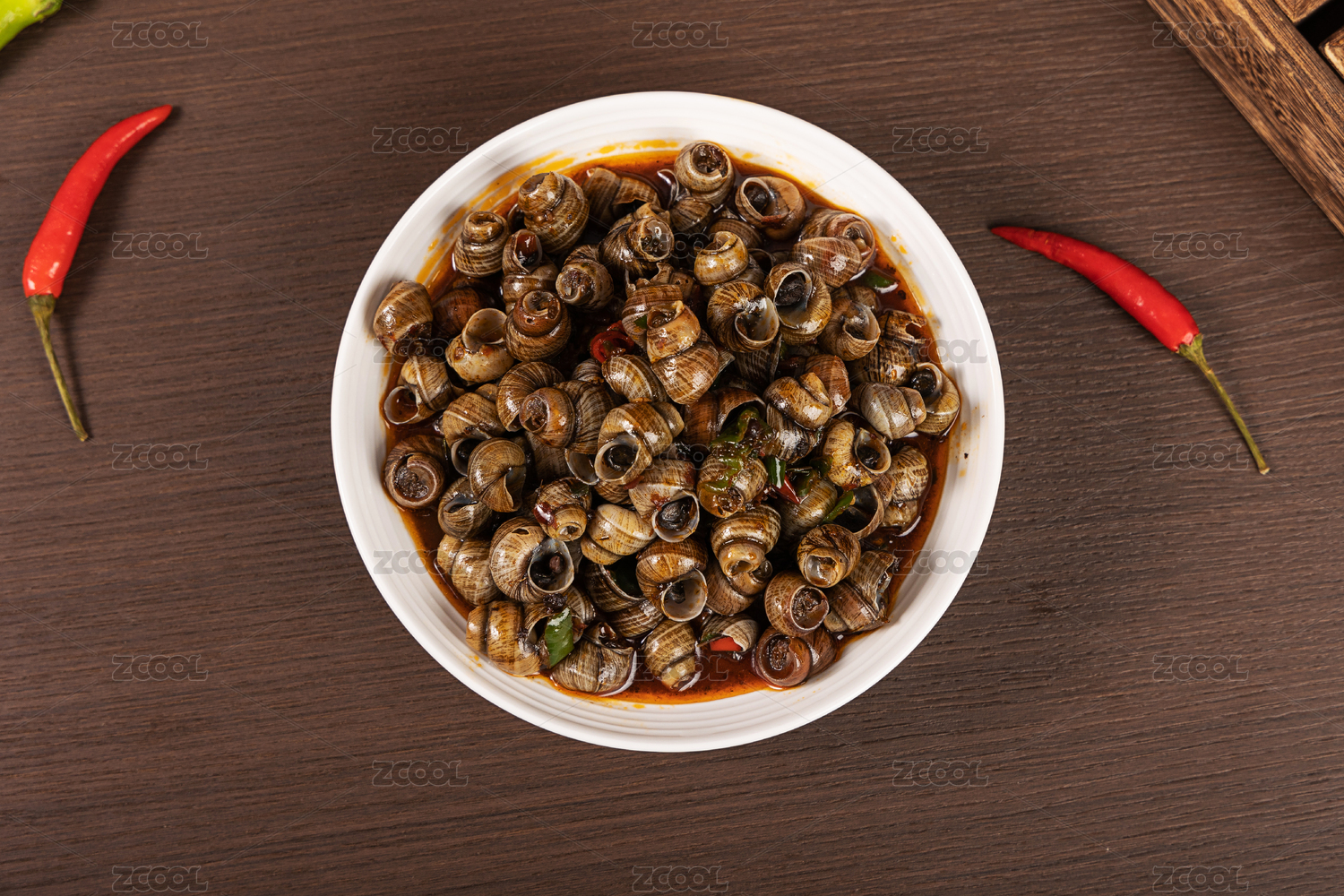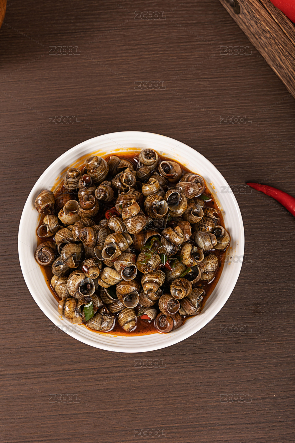 木桌背景中的传统小吃炒田螺