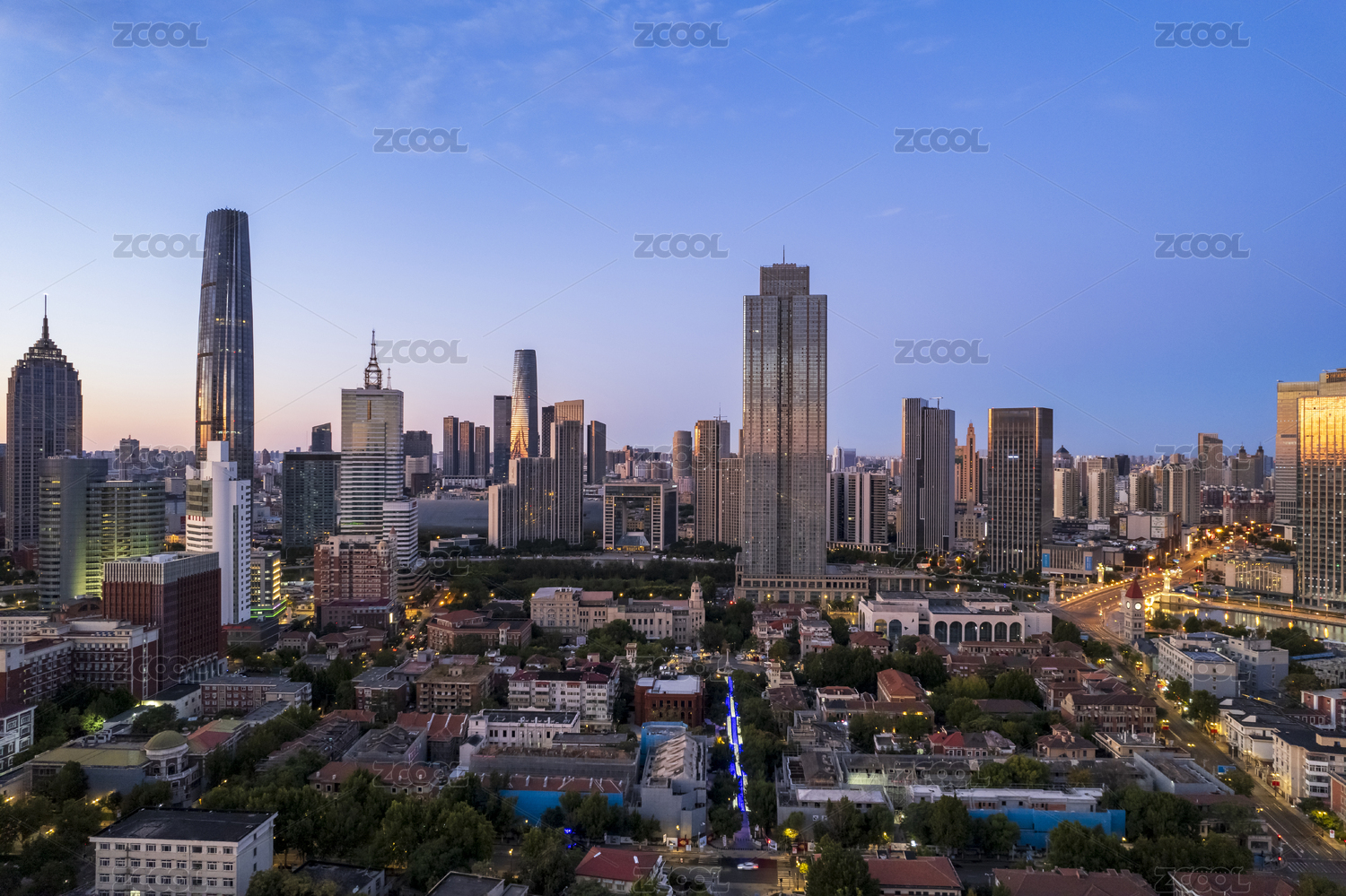 天津环球金融中心海河沿岸城市建筑日落晚霞