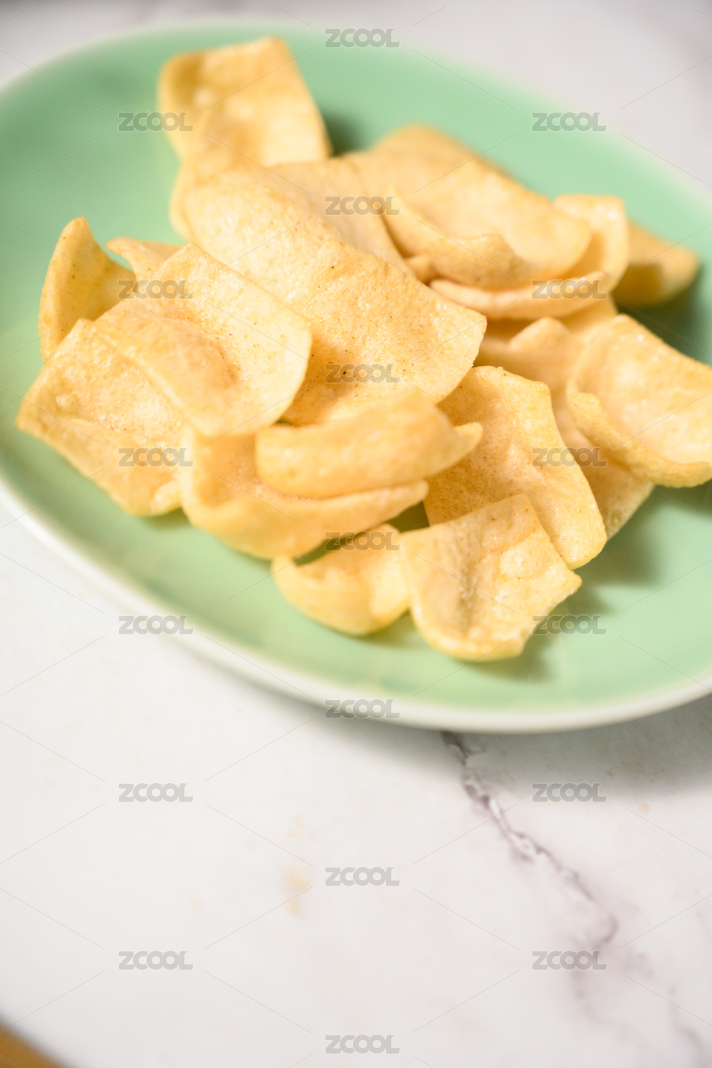 桌面上的盘子里的美味可口的油炸鱿鱼丝