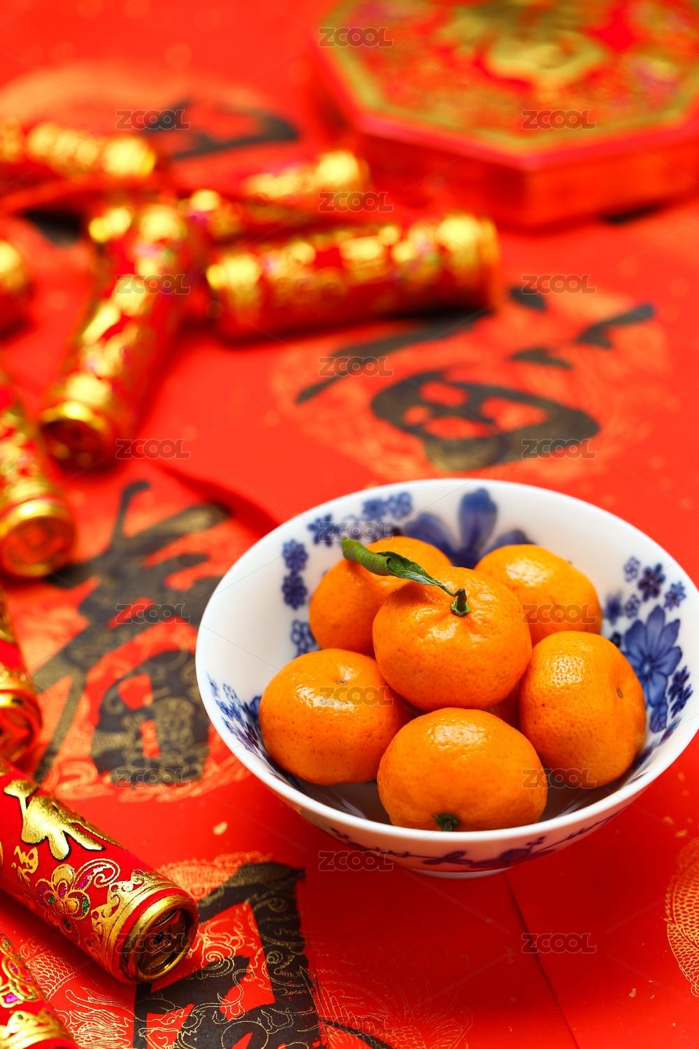 春节桔子,鞭炮,春联和福字背景