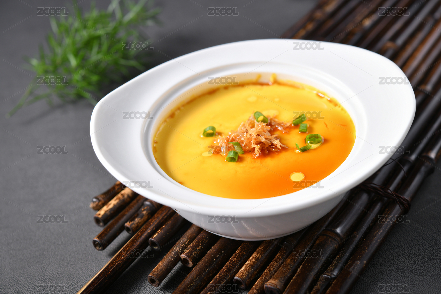 米色圆盘装的虾仁蒸水蛋摆放在寿司帘上