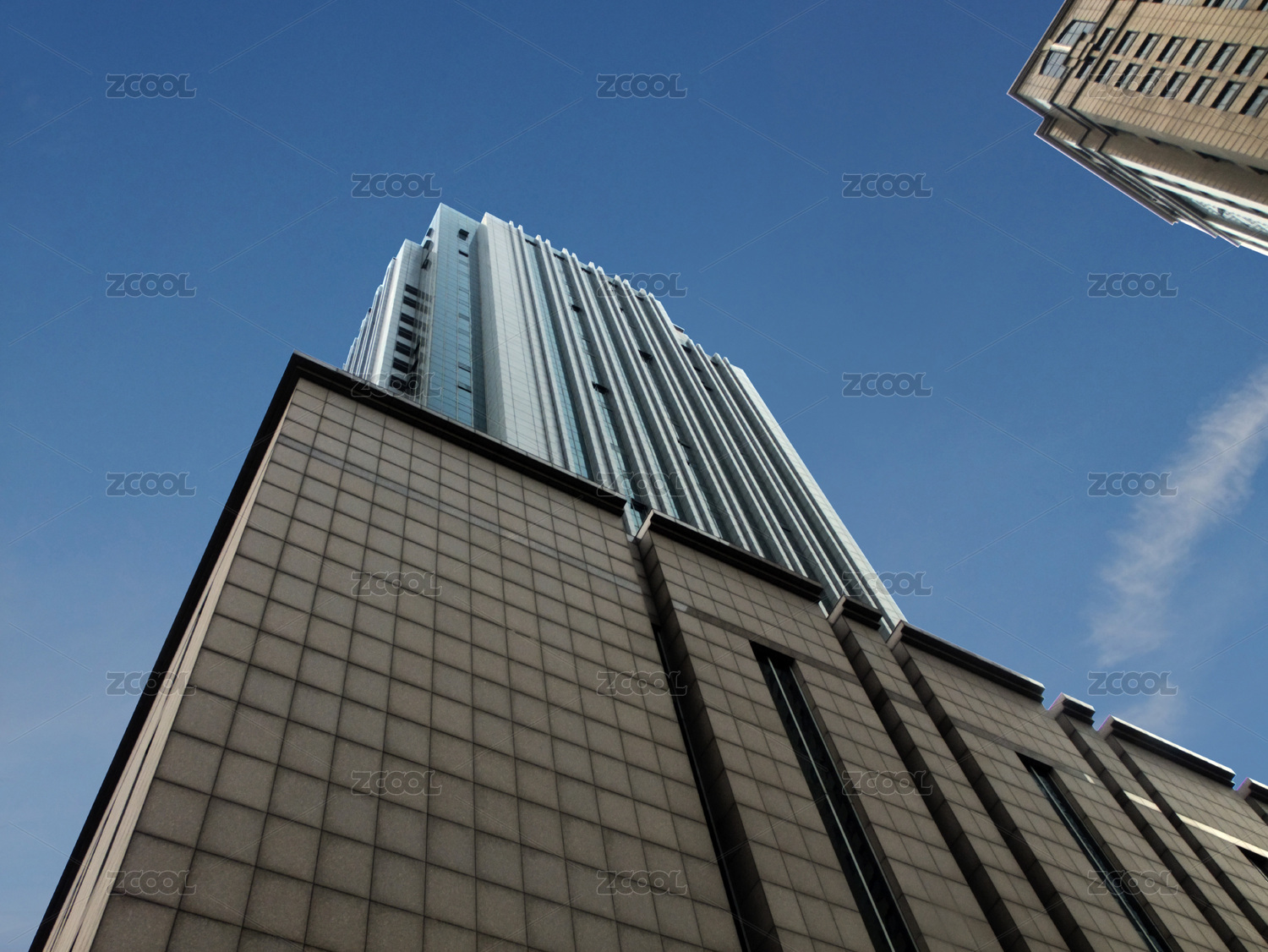 蓝色玻璃幕墙商业建筑仰拍