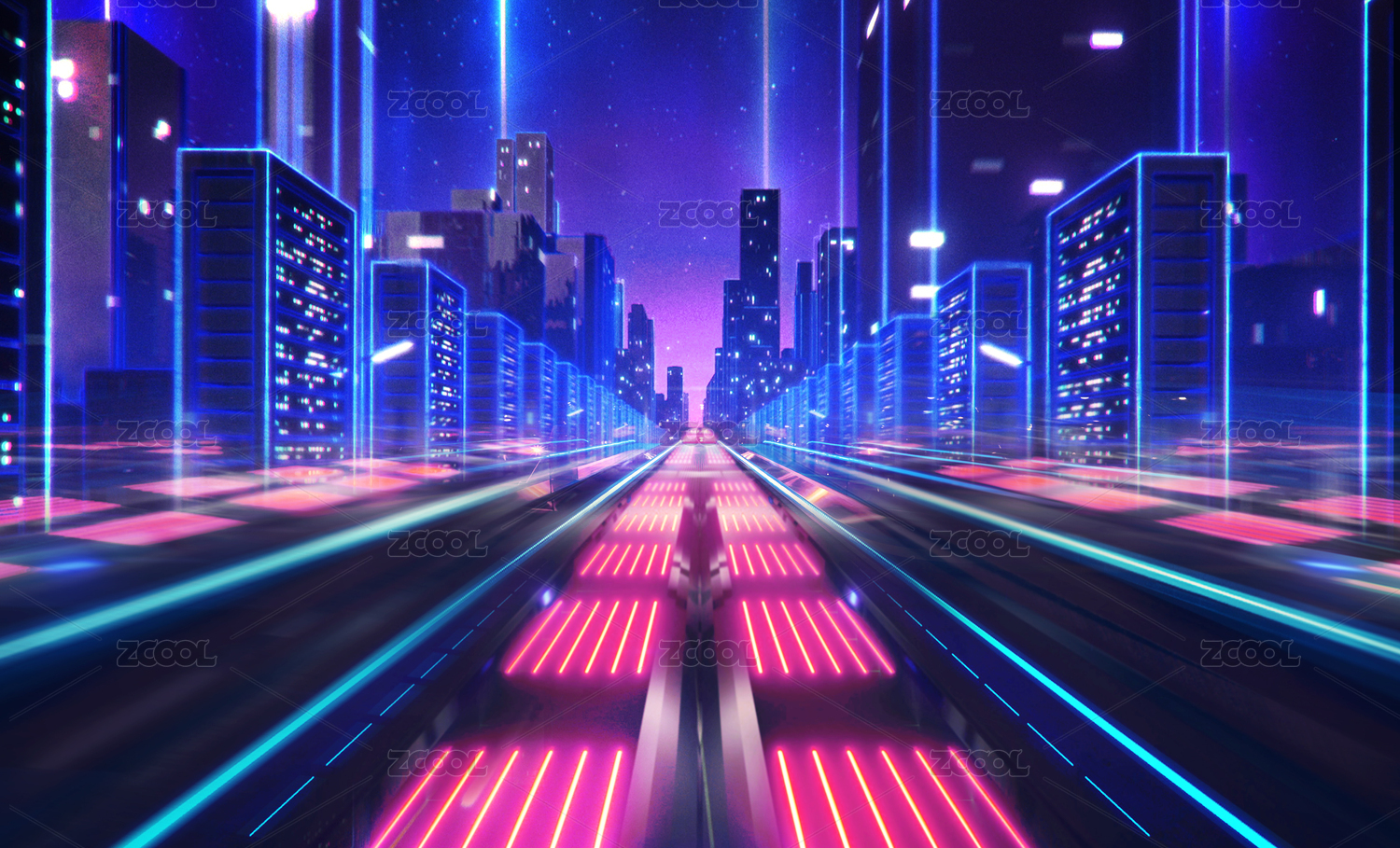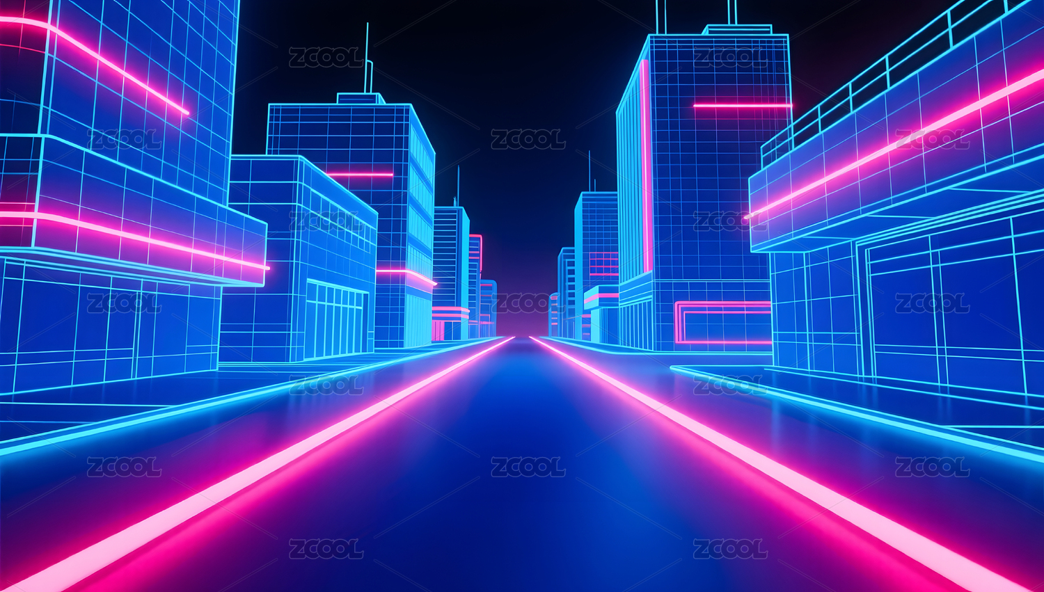 夜晚抽象荧光色城市建筑的马路3D立体插画