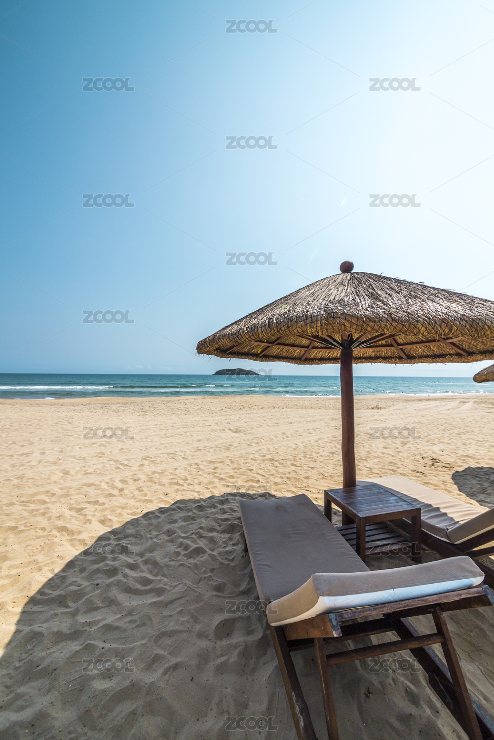海南省三亚市亚龙湾休闲海滩上的遮阳棚和躺