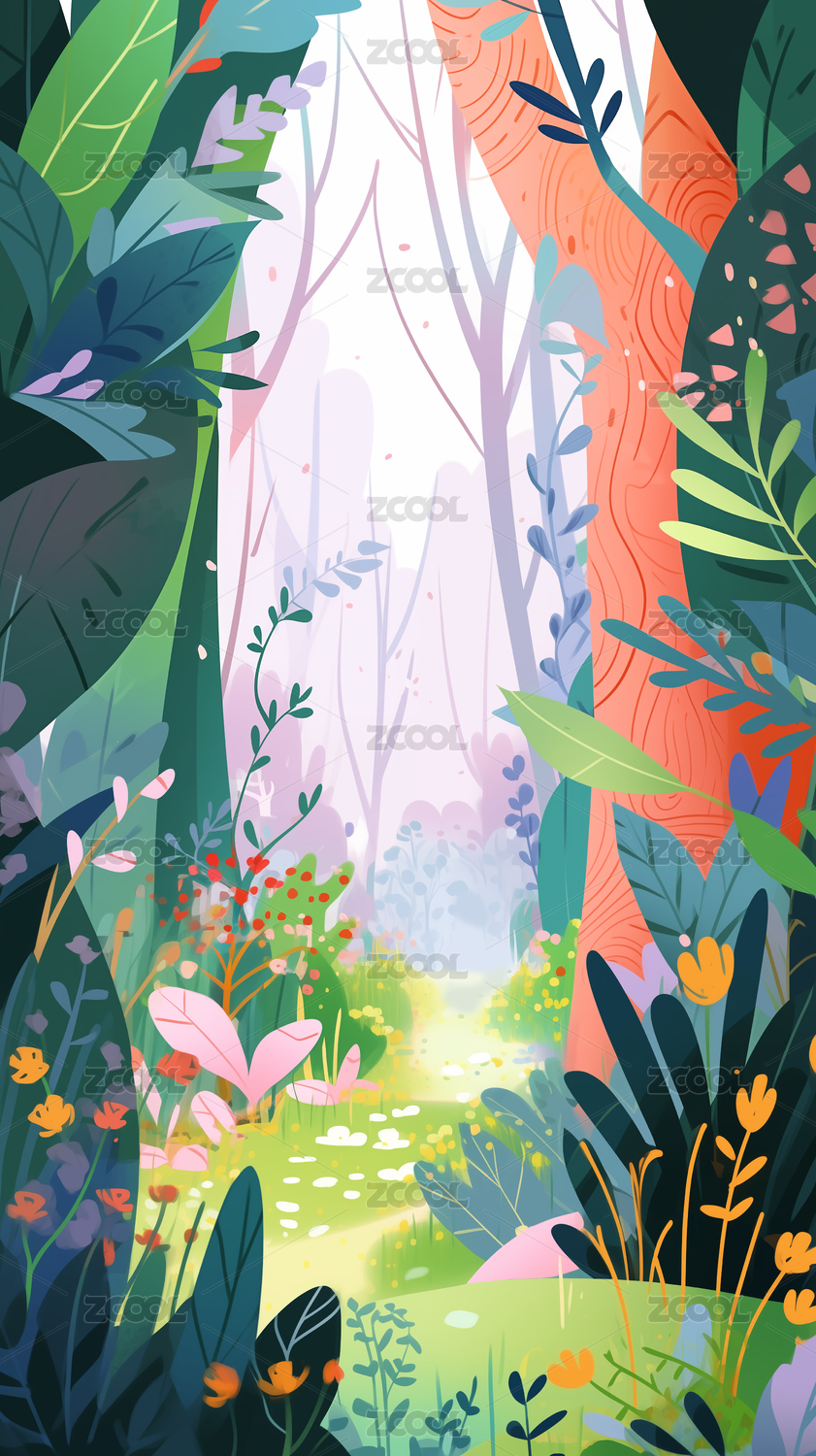 手绘卡通唯美春天的树林风景背景插画