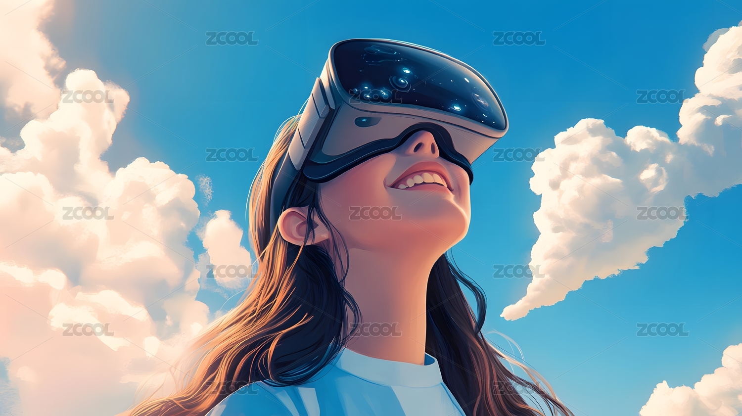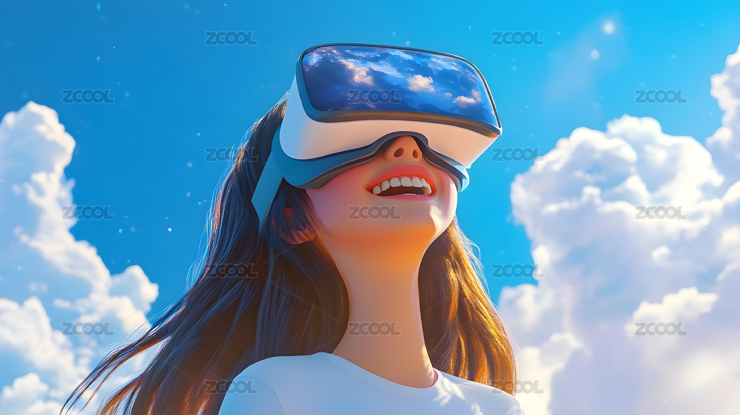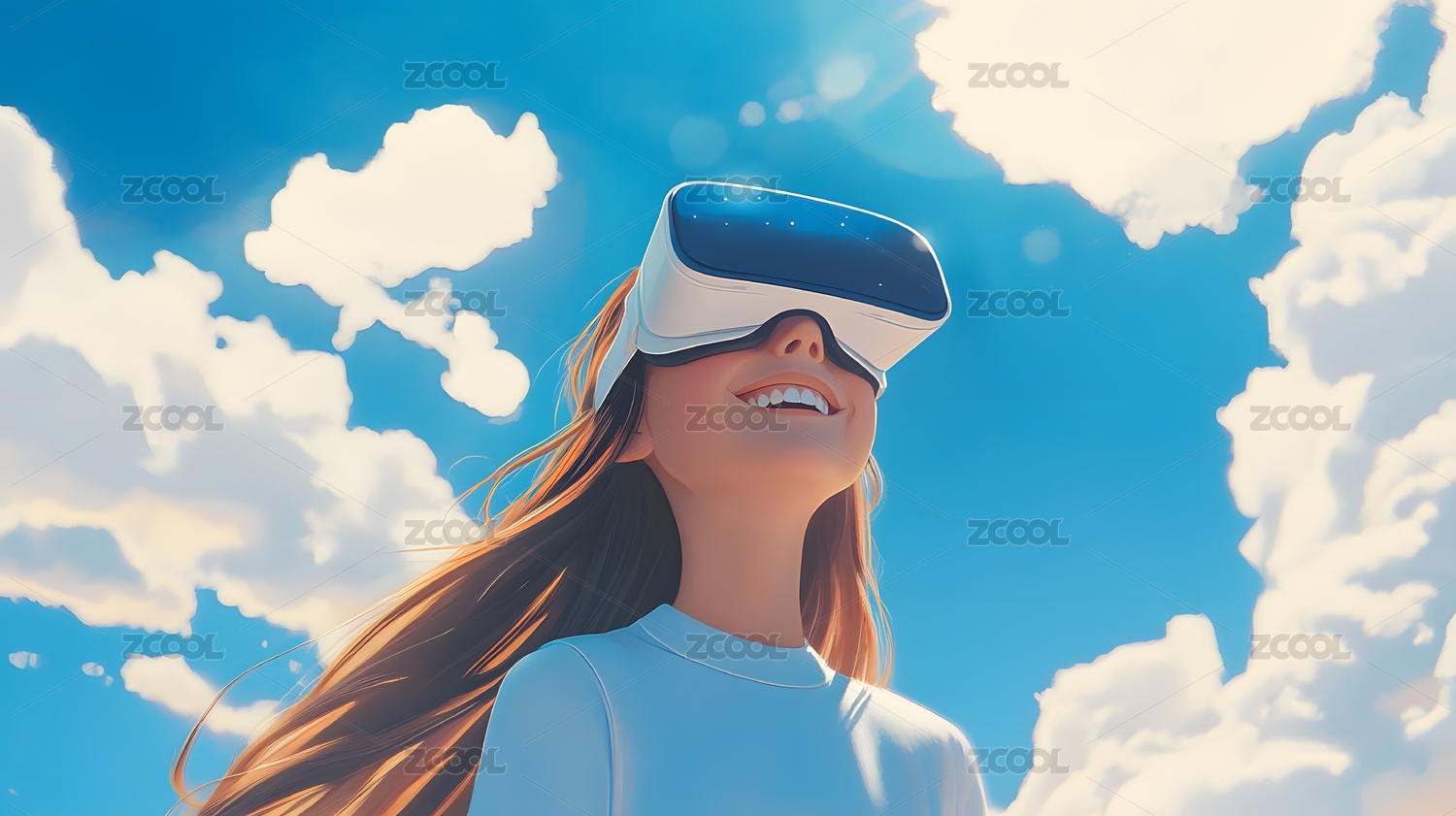 身穿黑衣的女孩戴着VR眼镜仰望星空