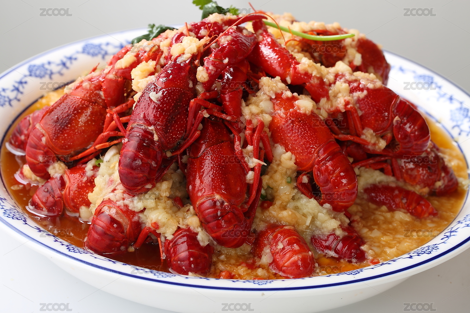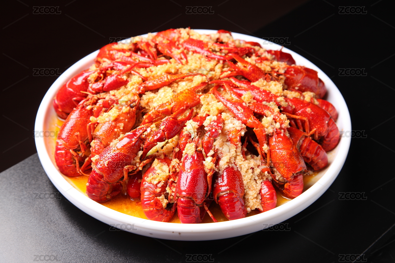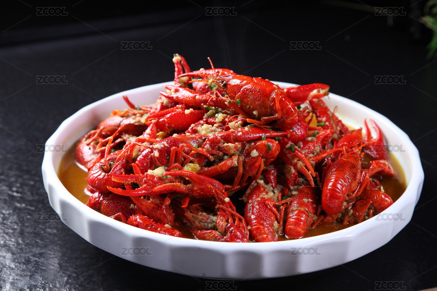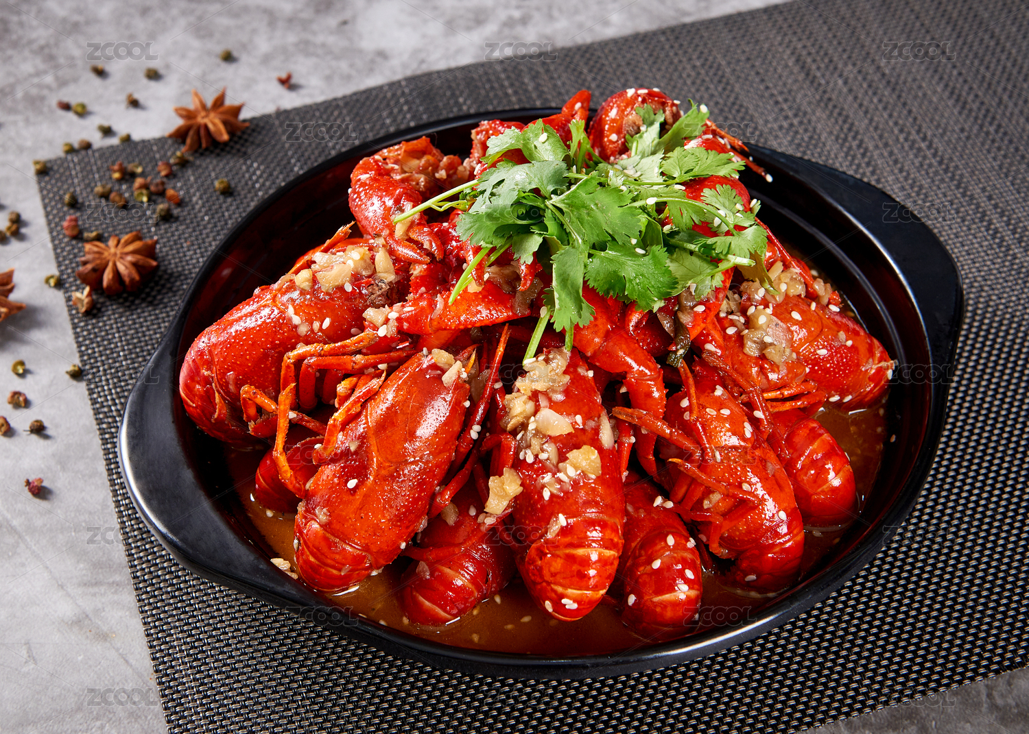 深色背景上一盘油焖大虾,上面点缀着香菜