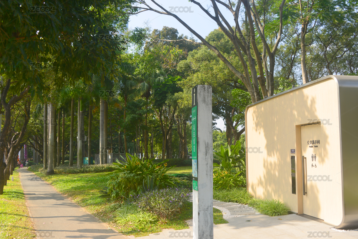 深圳园博园林荫步道上排列整齐的棕榈树景观