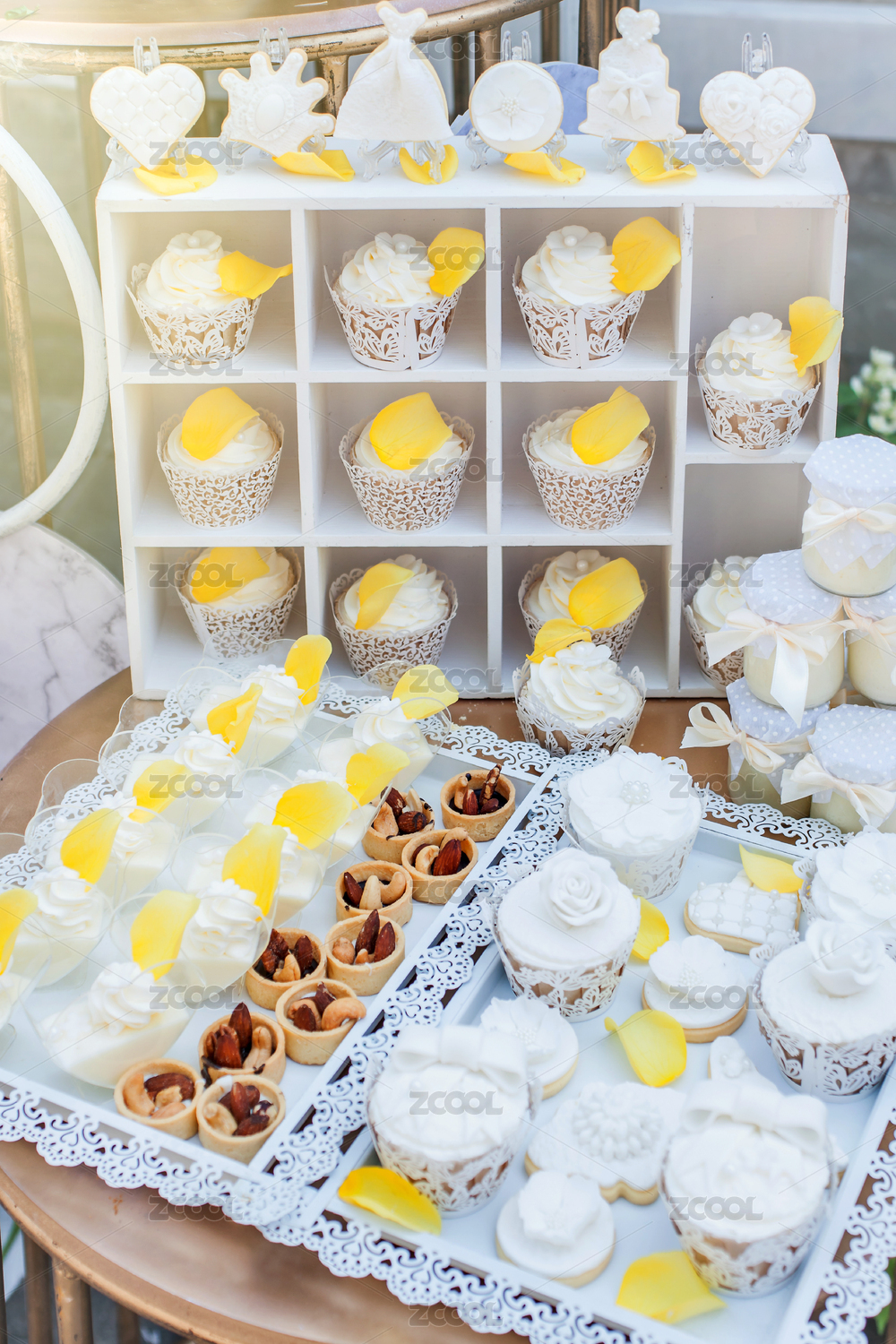 托盘里摆放的杯子奶油蛋糕,可爱甜品。