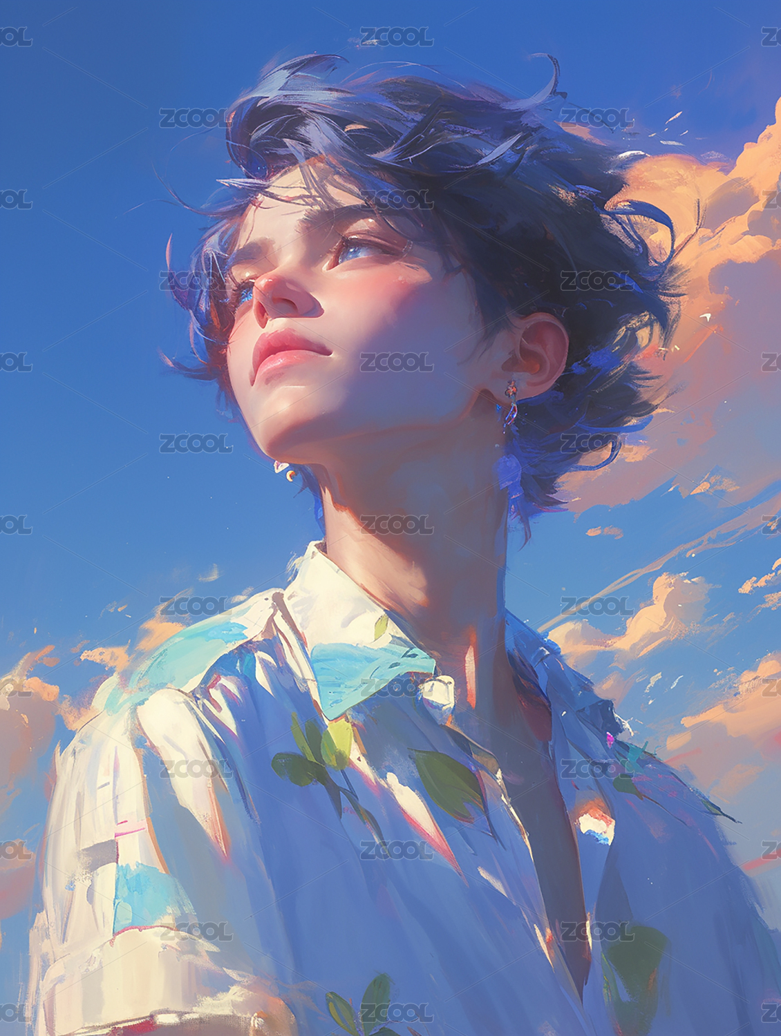 男生,女孩,帅哥,天空,云彩,放空,竖构图,侧面视角,卷发