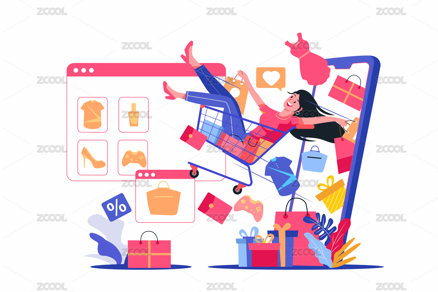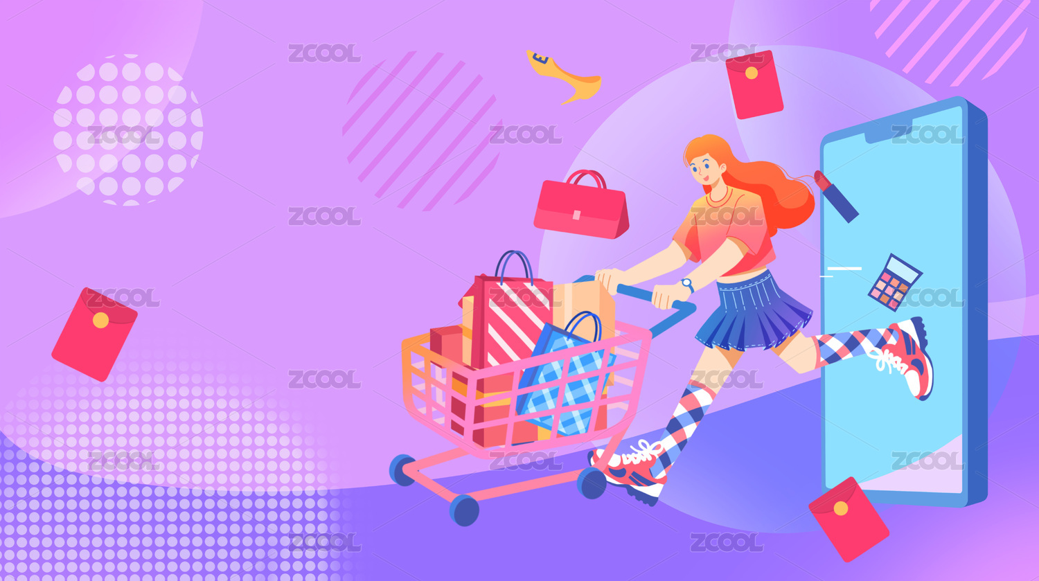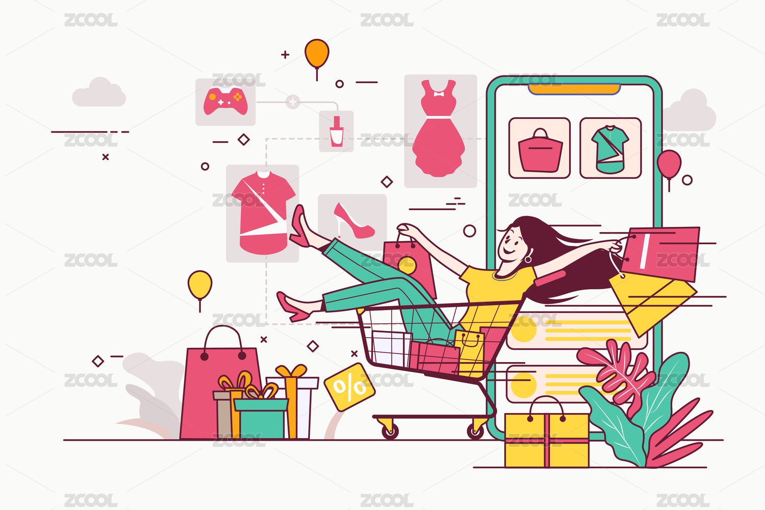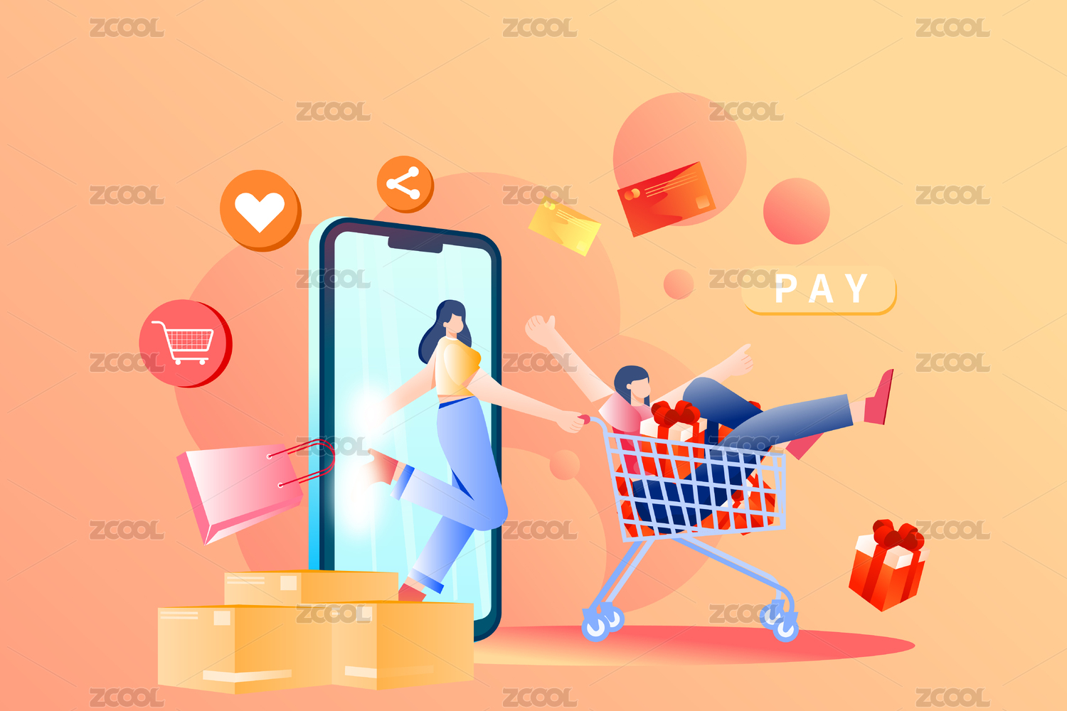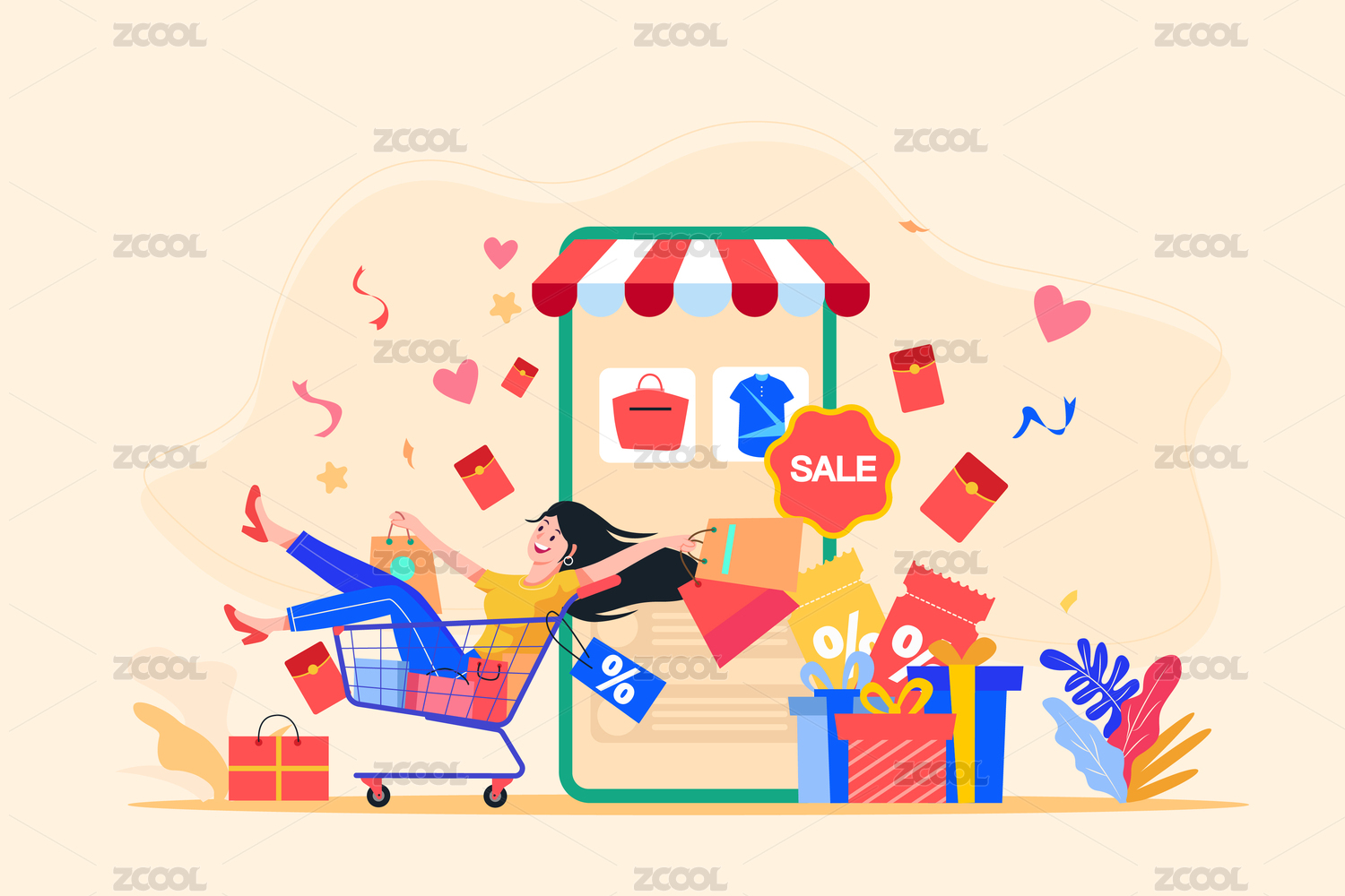 电商购物节的节日促销商业活动,时尚女性用手机在网上购物消费的矢量插画背景