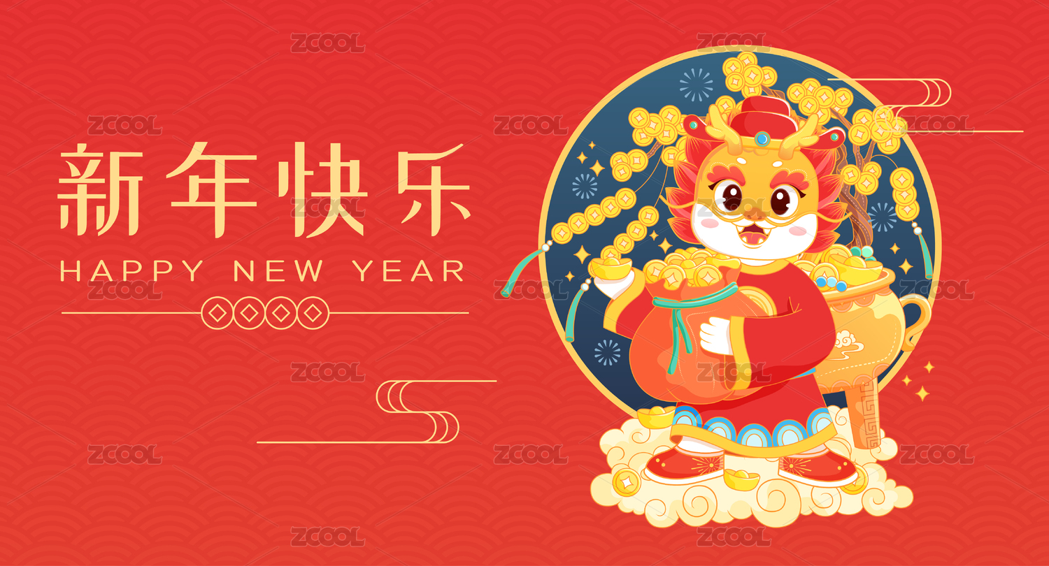 龙年春节财源广进招财进宝横幅矢量插画海报