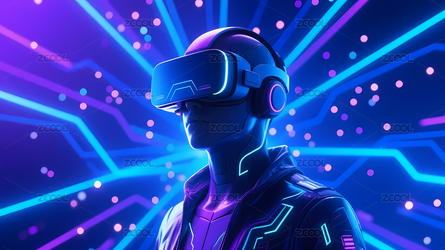 戴着VR头显的男子身处未来霓虹都市