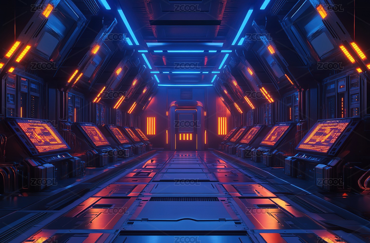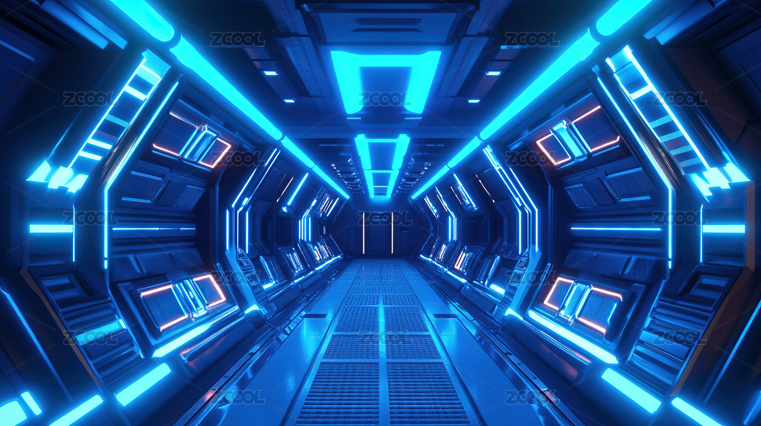 3D渲染科幻几何隧道霓虹灯线概念插图