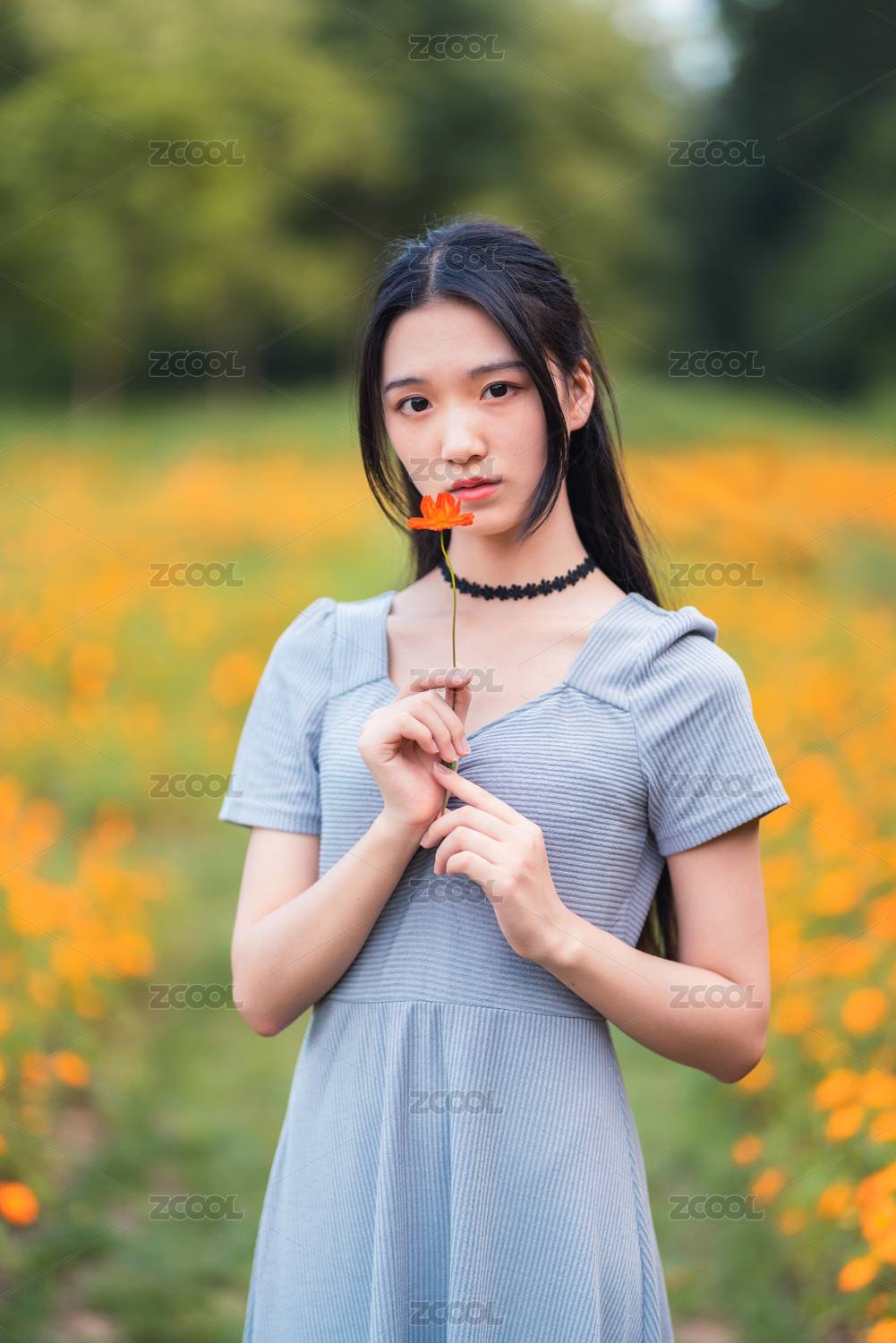 身穿蓝色的长裙的漂亮的女生拿着一朵小花站在花海里