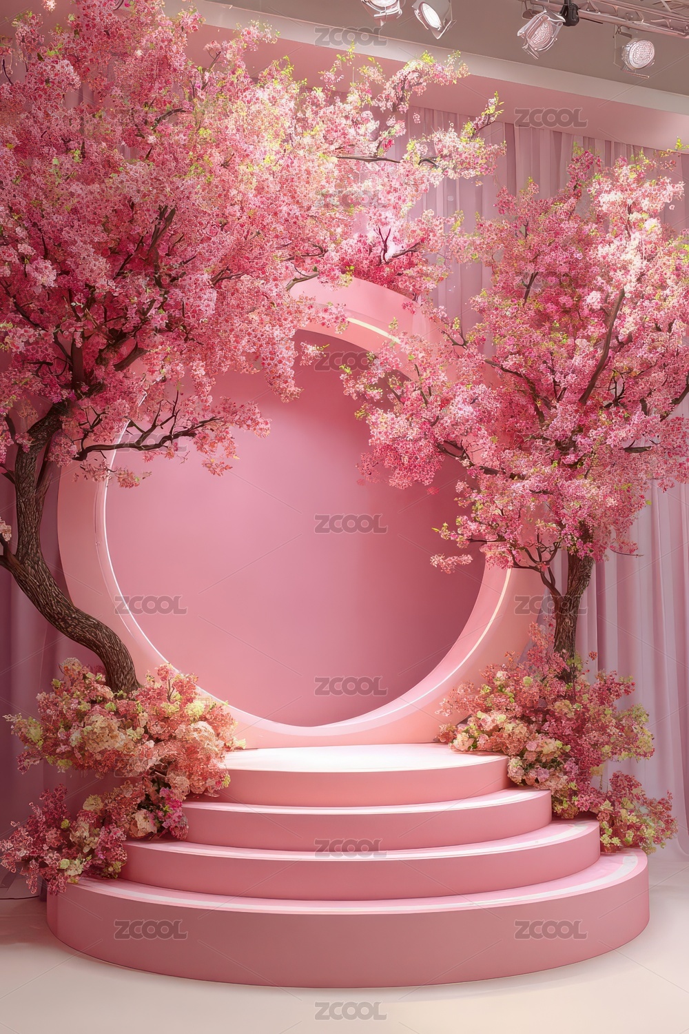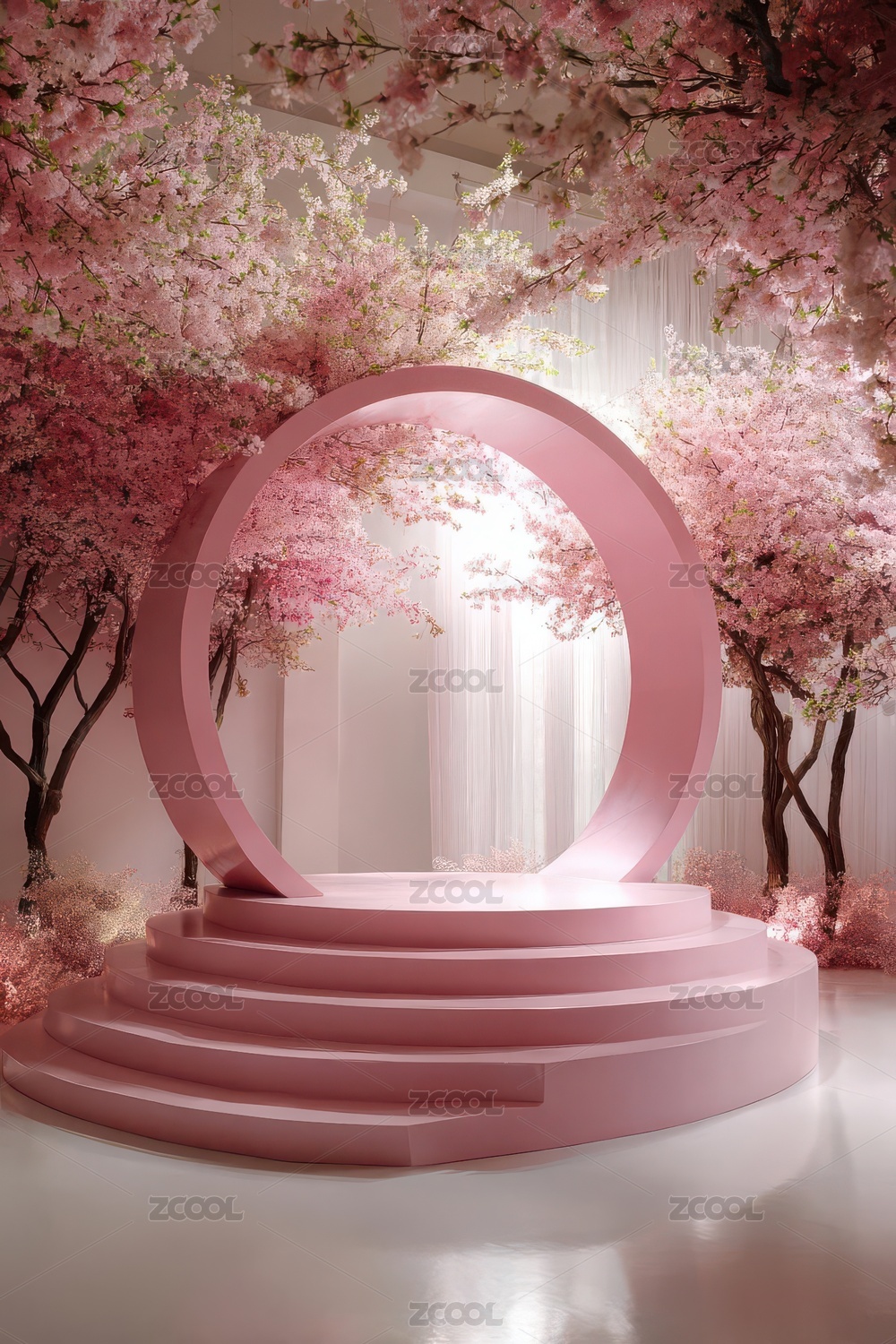 粉色樱花环绕的圆形舞台装置