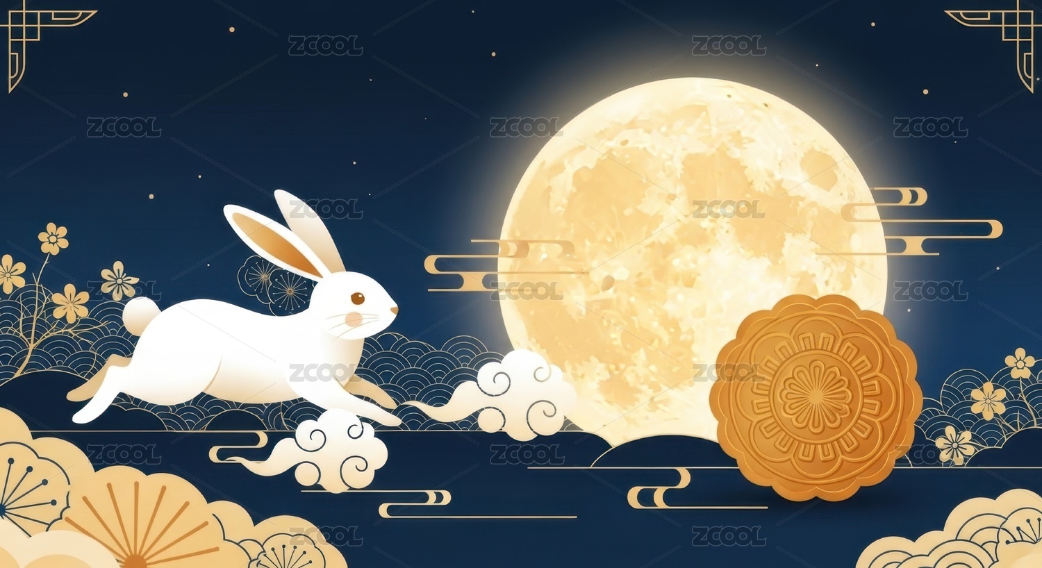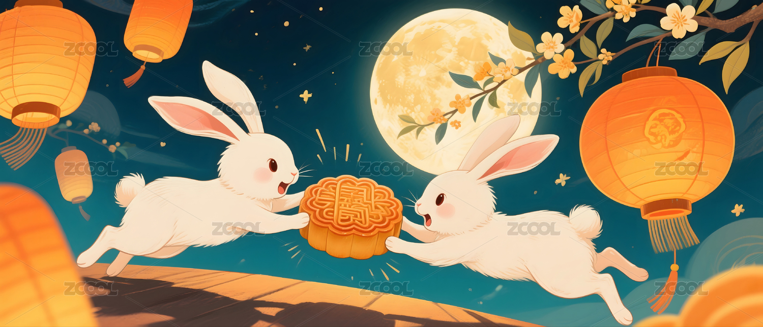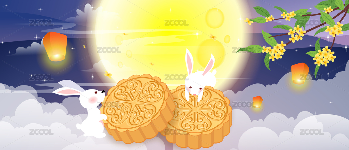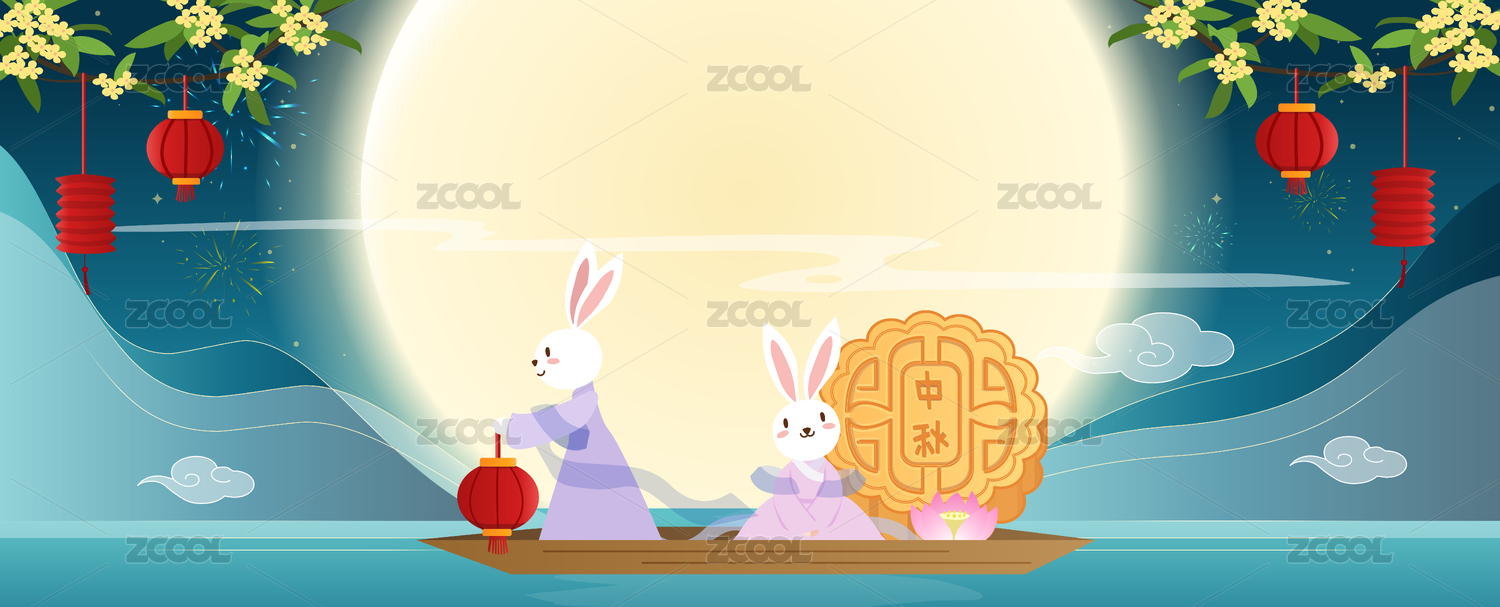 中秋节桂花兔子灯笼皓月扁平矢量图插画