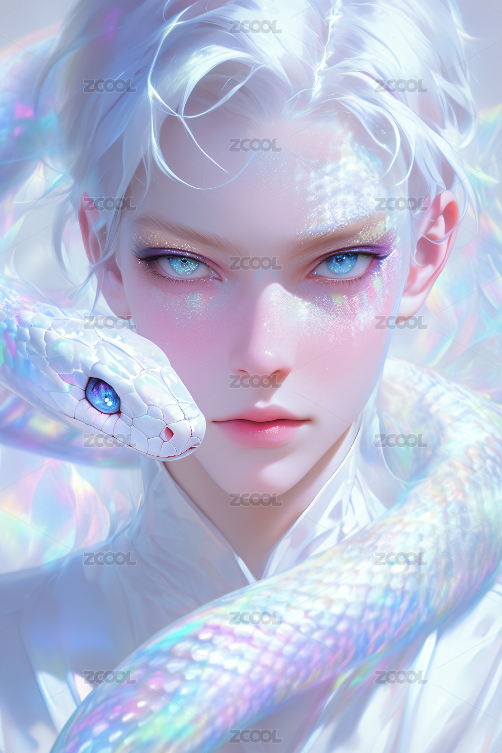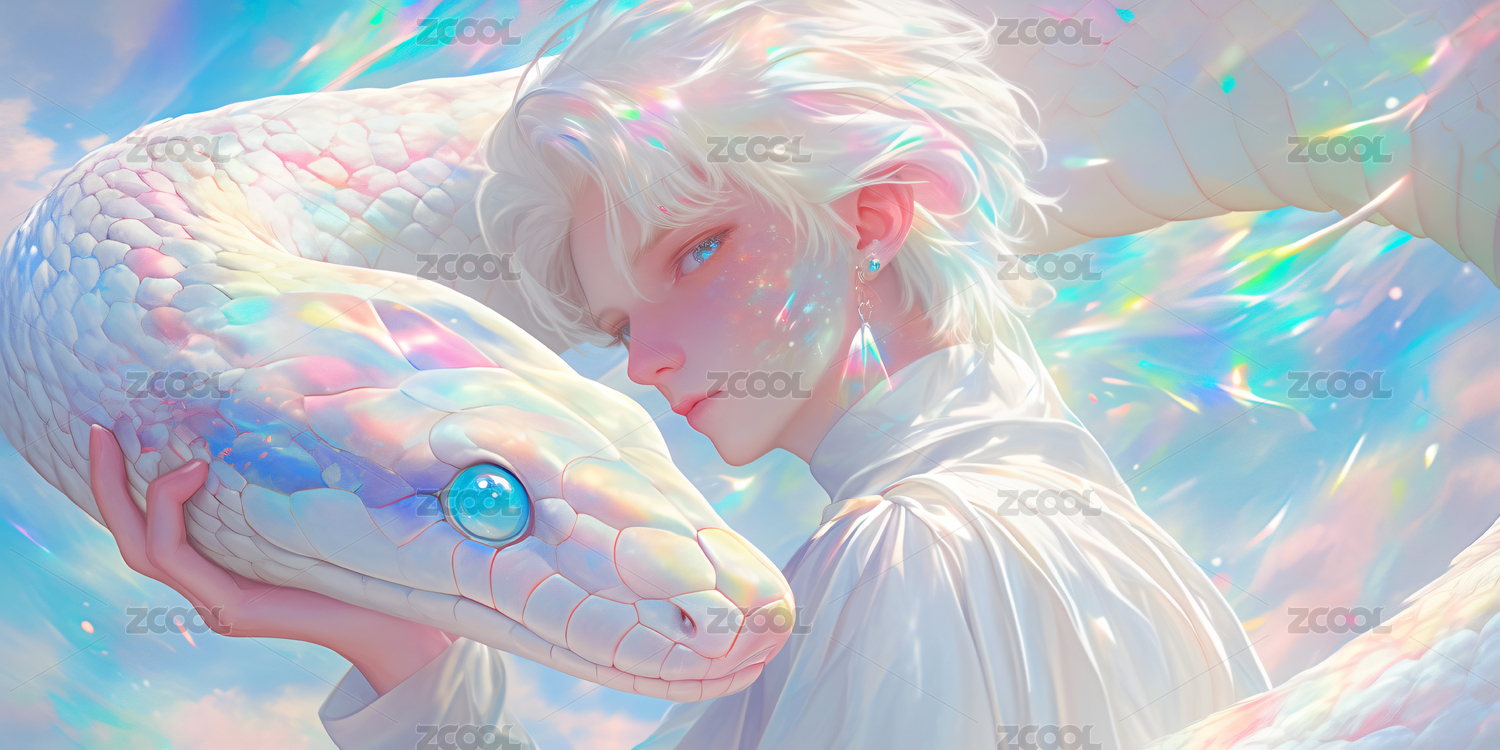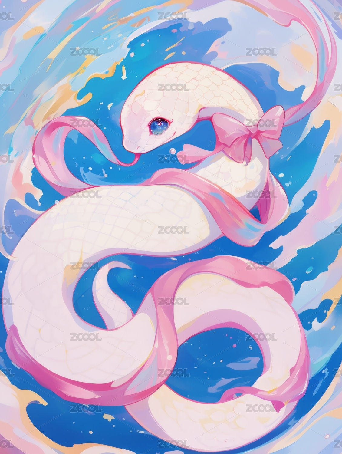 少女,蛇,蓝色,女孩,云,梦幻,清新,生肖,动物,卡通