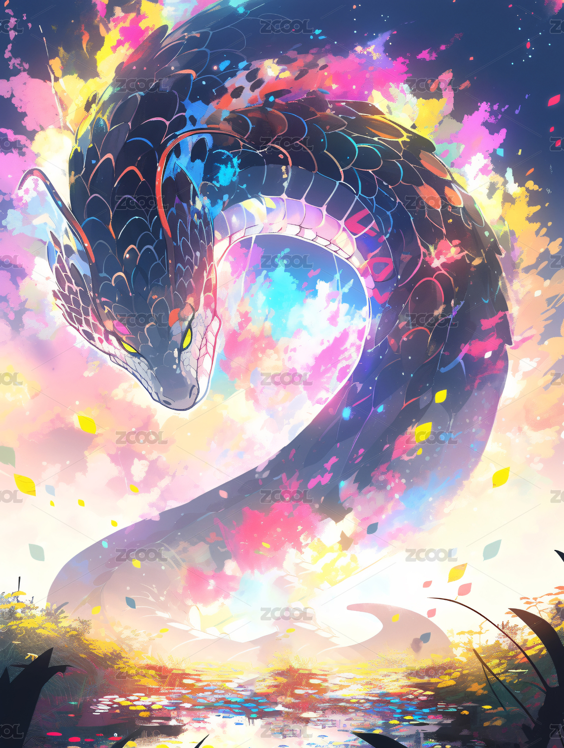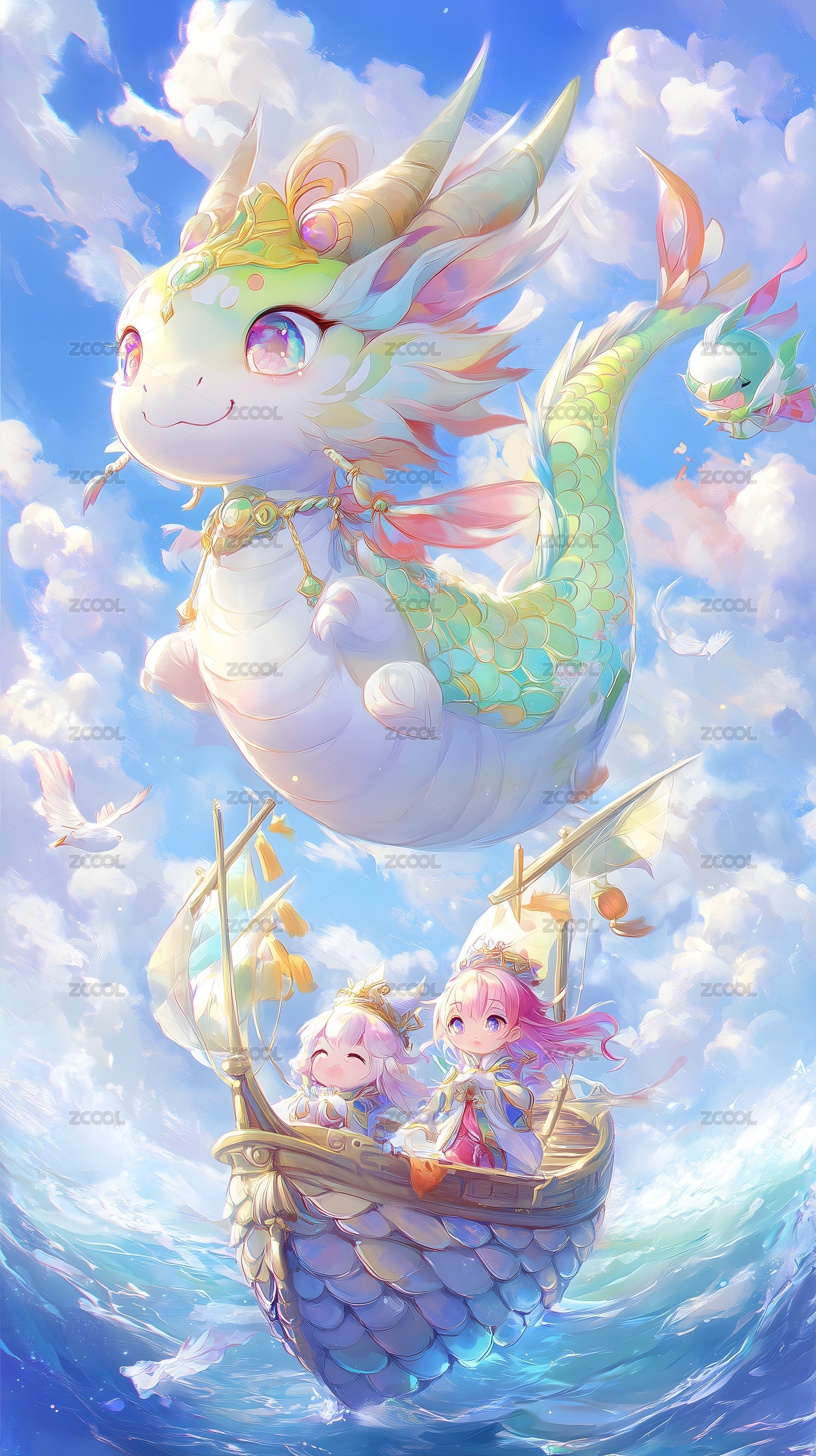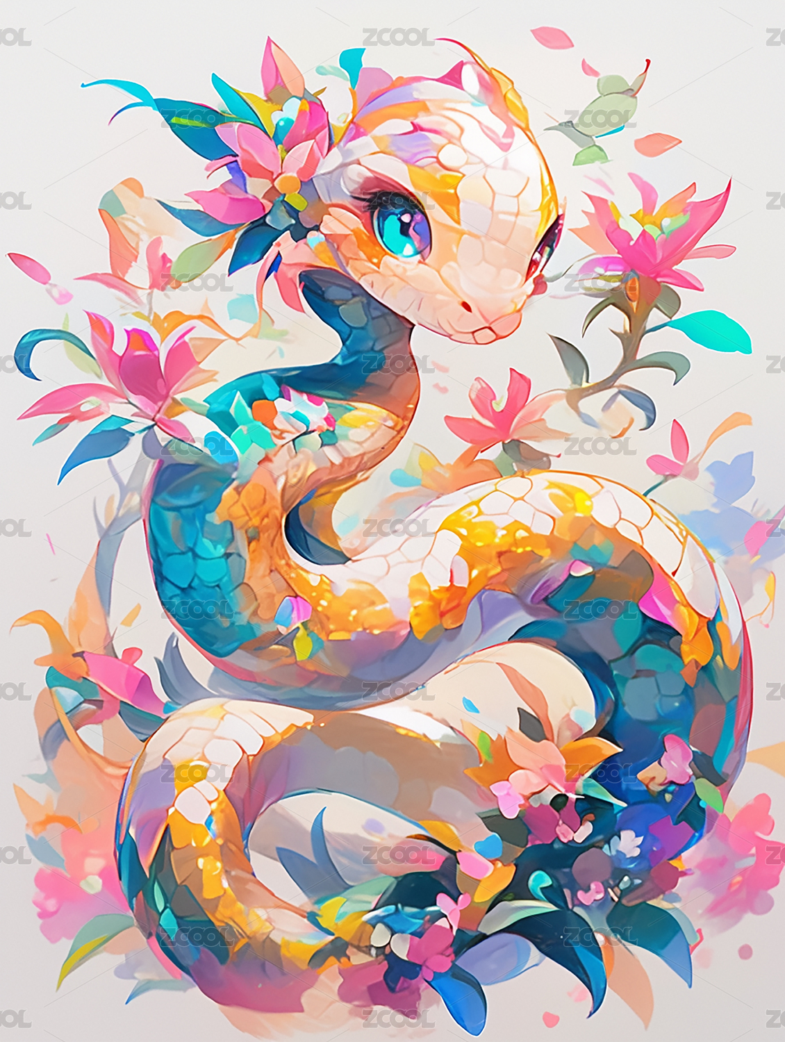 少女,蛇,蓝色,女孩,云,梦幻,清新,生肖,动物,卡通