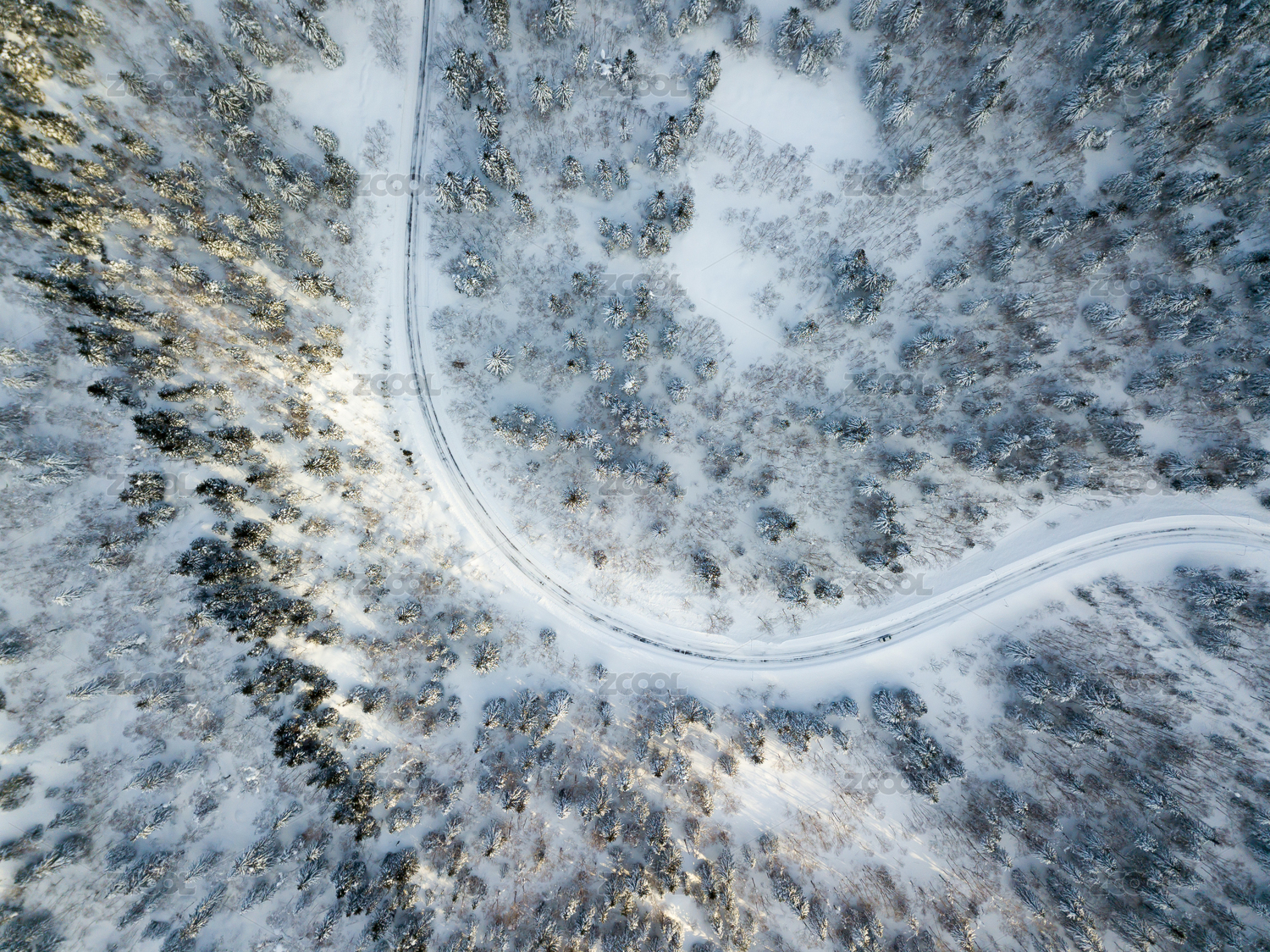 航拍冬天雪后的中国新疆喀纳斯弯曲的山路