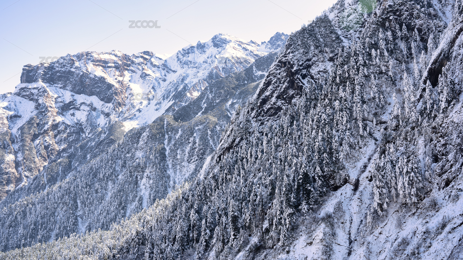 四川甘孜海螺沟冬季山上的植被森林