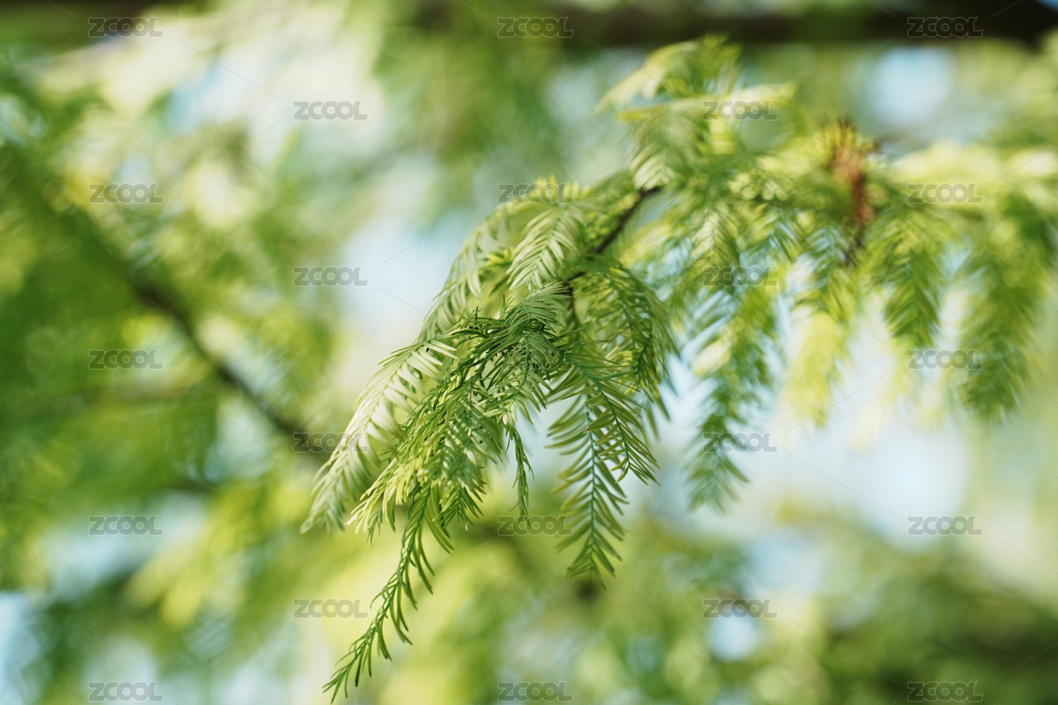 春天阳光下的绿色水杉枝叶逆光仰拍特写