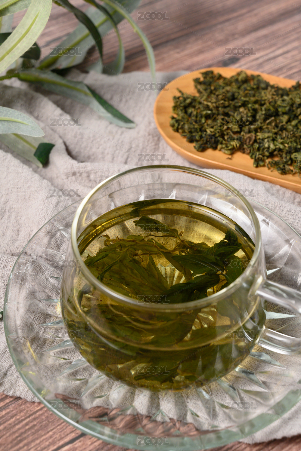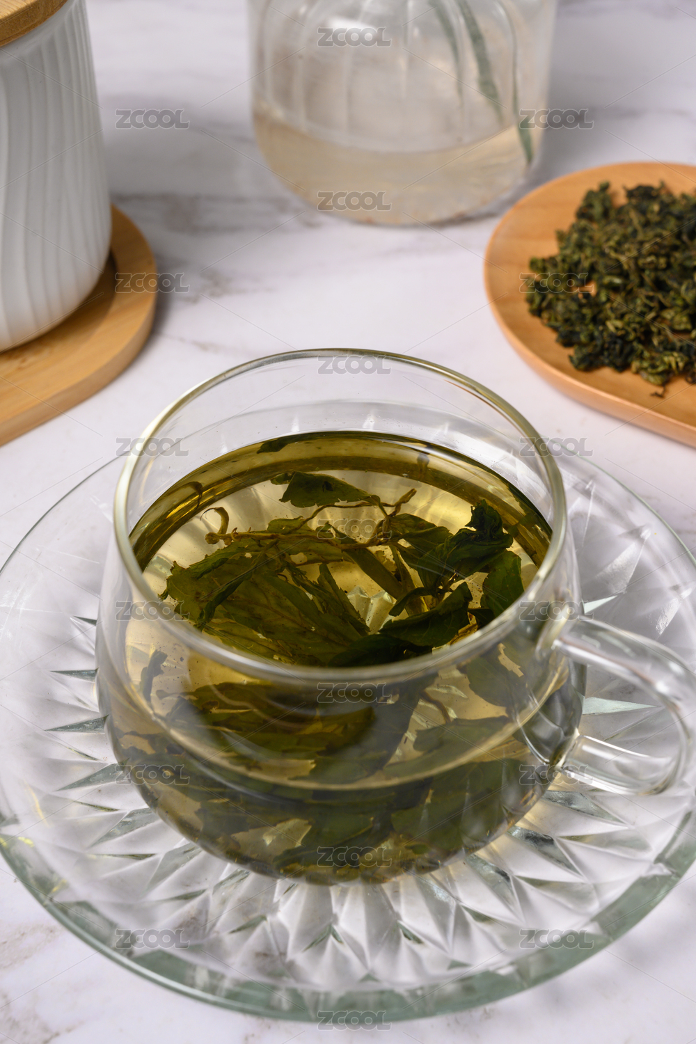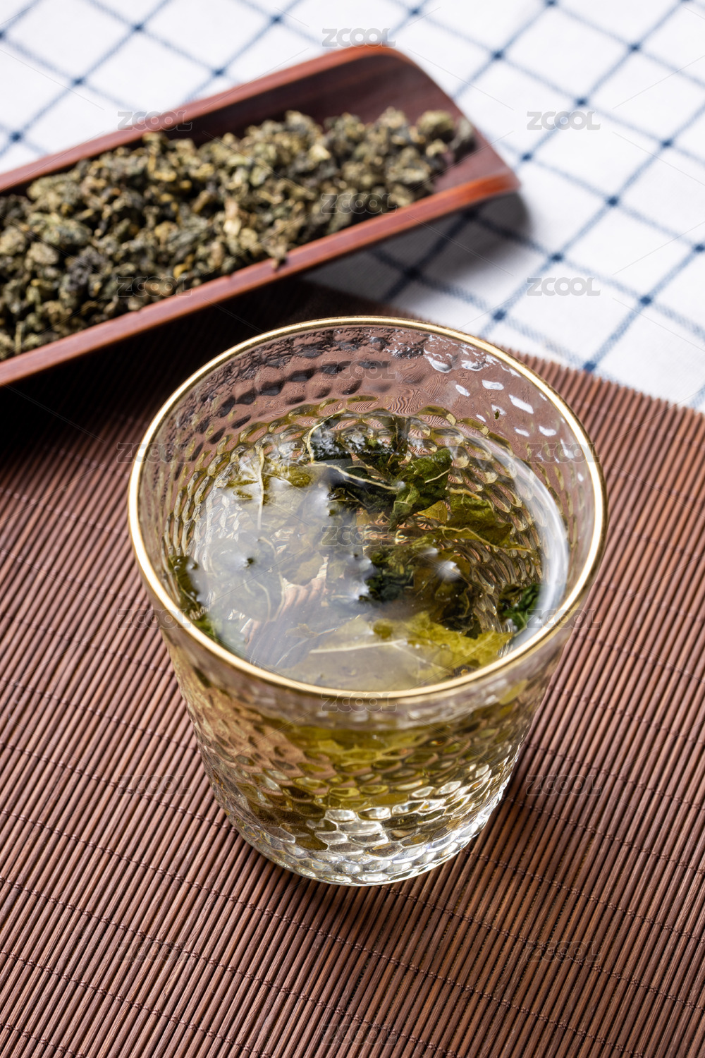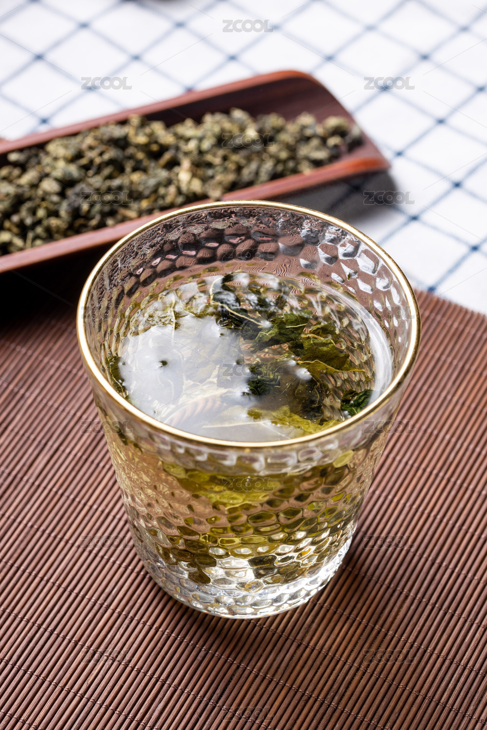 桌面上的杯子里的甘甜可口的高山绿茶
