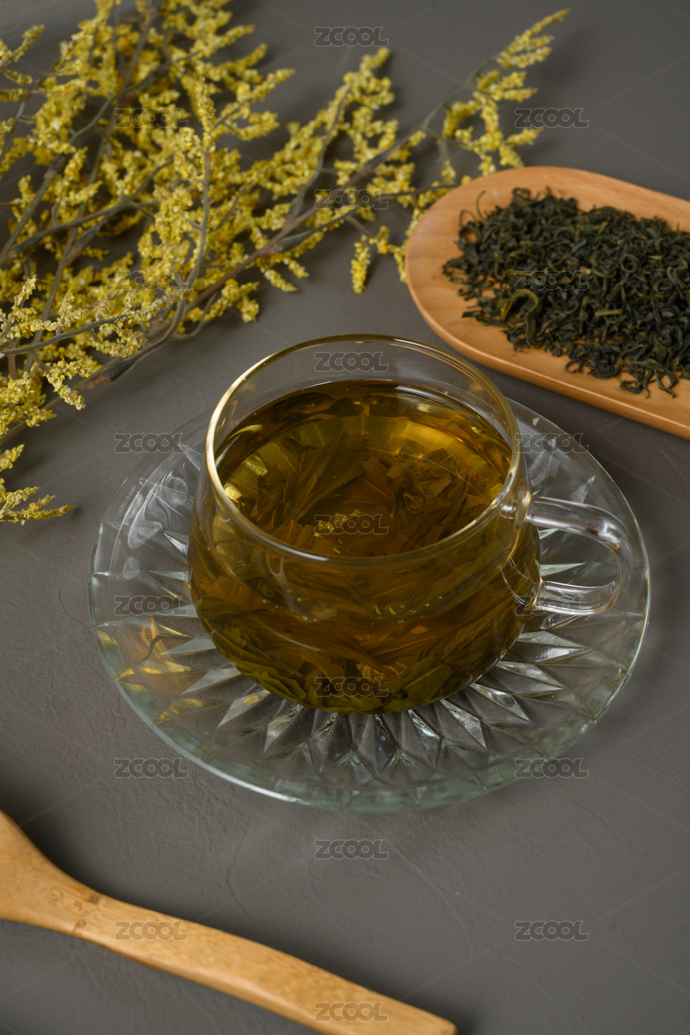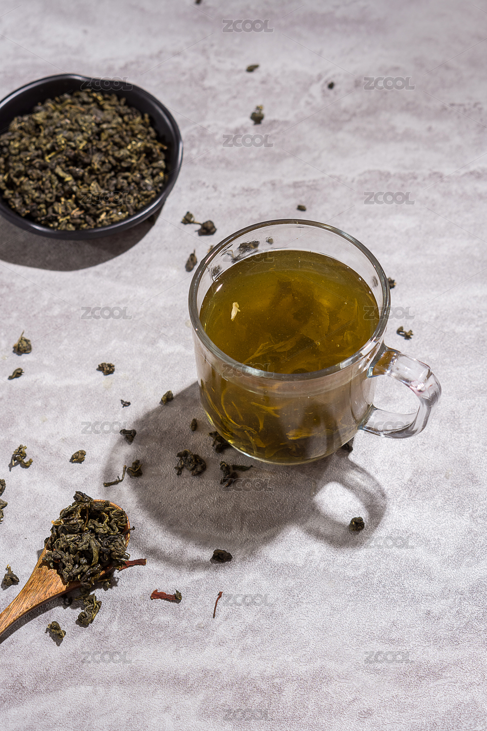 水泥板上茶杯与茉莉花茶