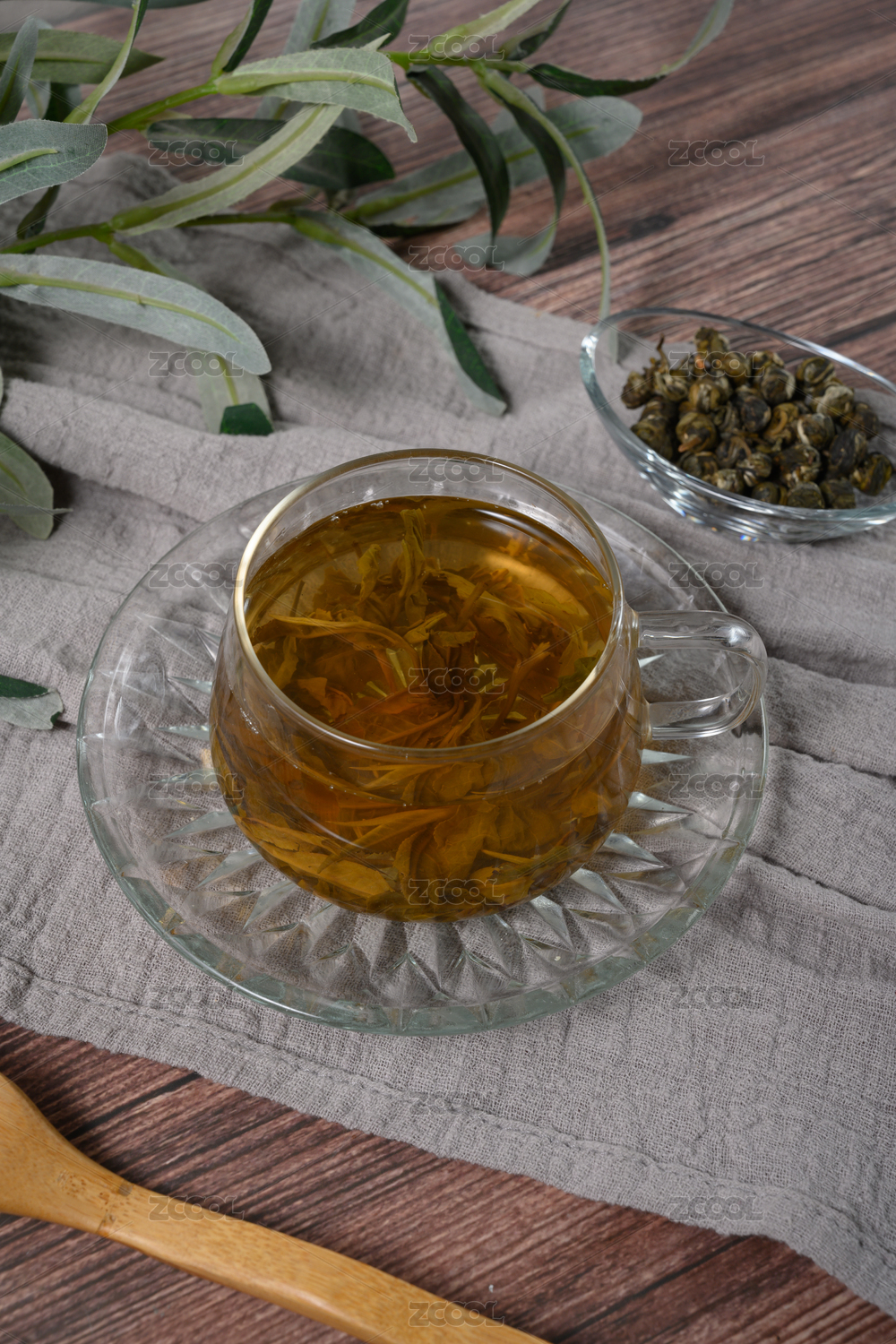 桌面上的杯子里的甘甜可口的茉莉吐珠茶