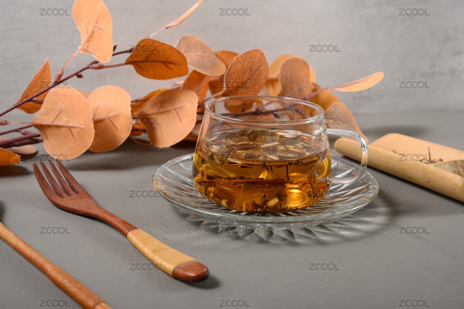 桌面上的杯子里的甘甜可口的秦皮茶