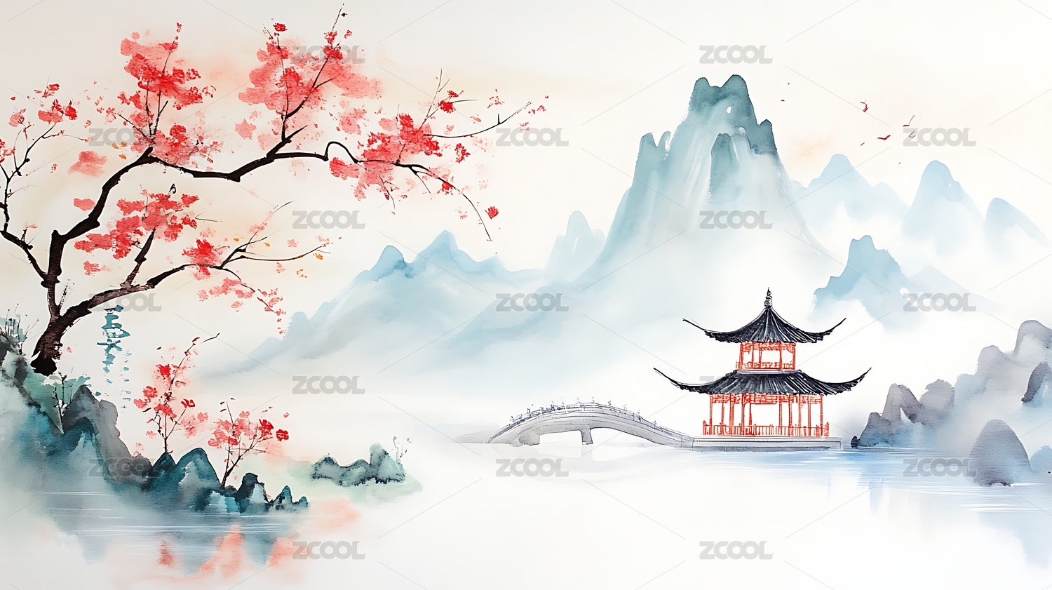 中国水墨画风格江南山水秋天春天拱桥亭子
