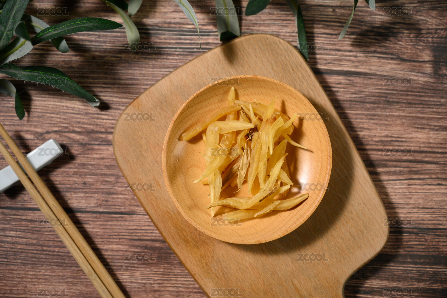 桌面上的盘子里的美味可口的油炸鱿鱼丝