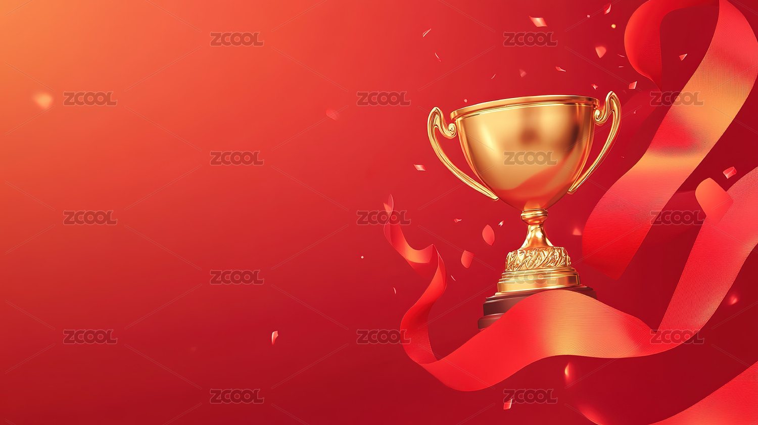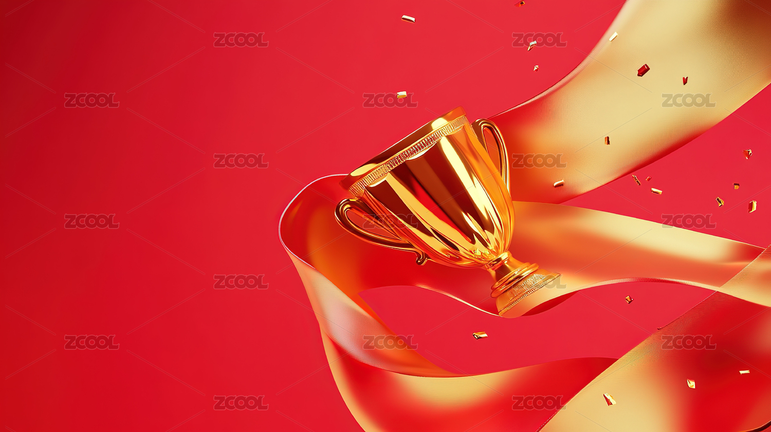 荣耀冠军金色奖杯红色绸缎喜庆庆祝