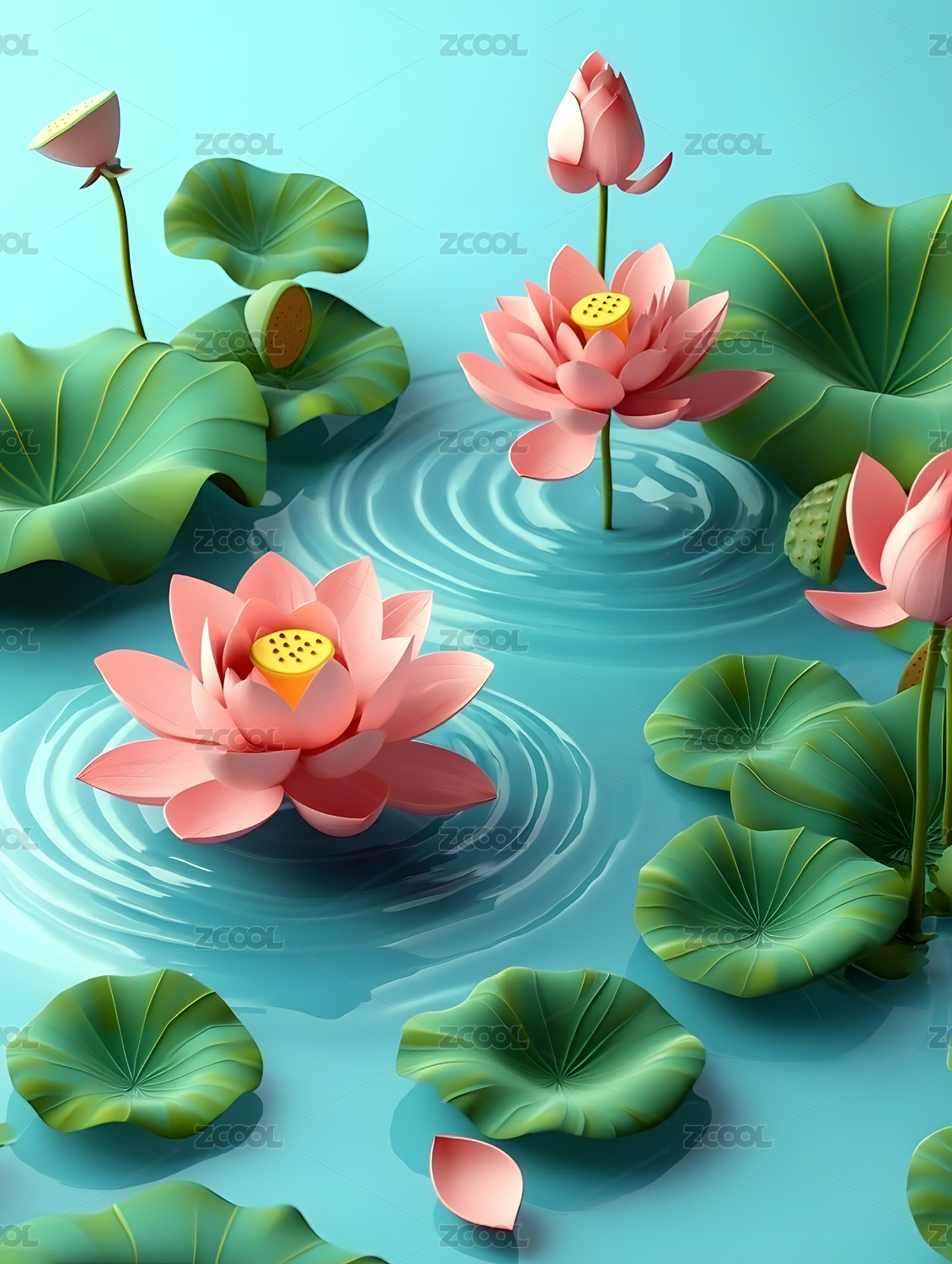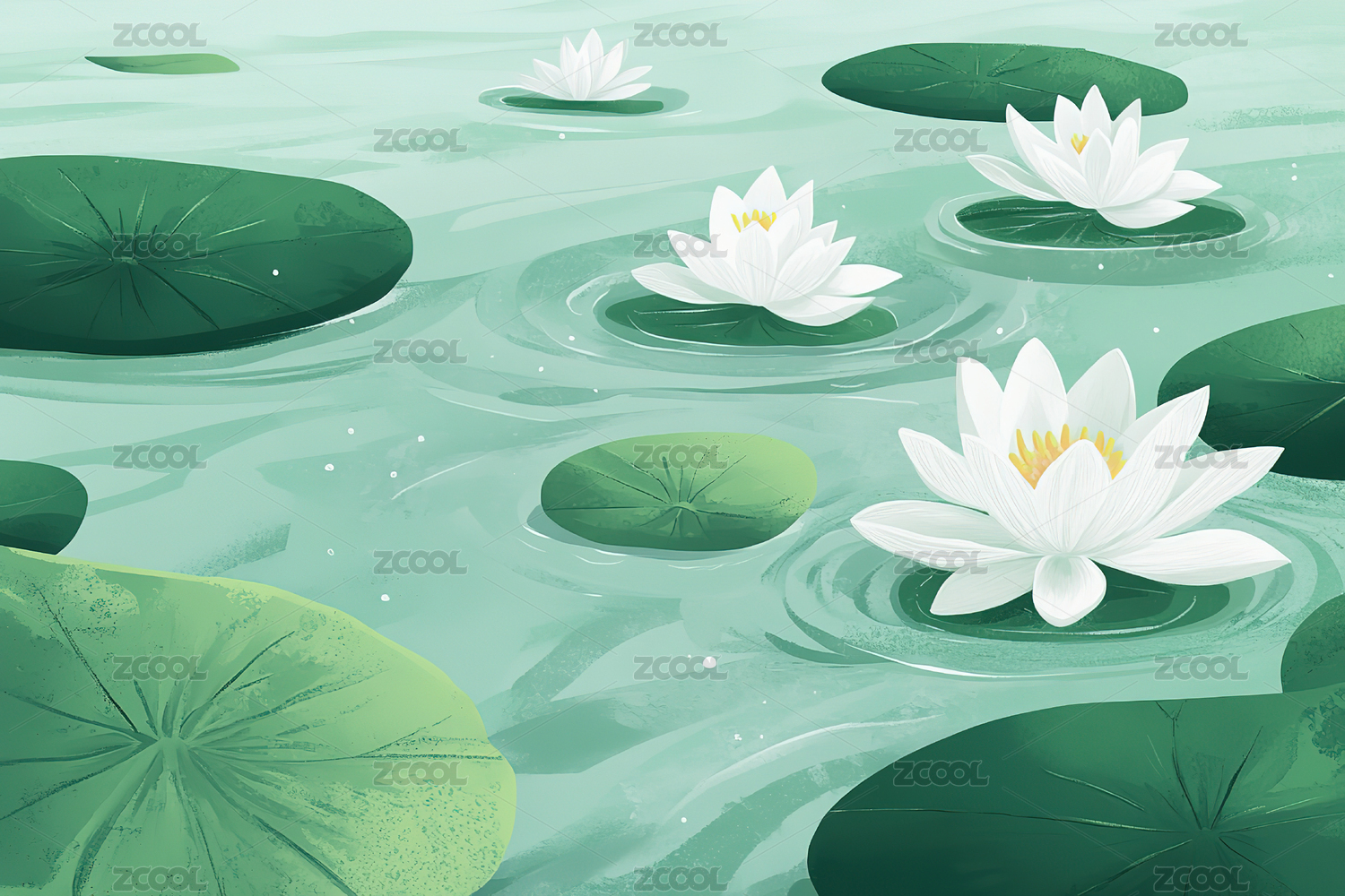 夏至荷塘盛开荷花与碧绿荷叶手绘插画