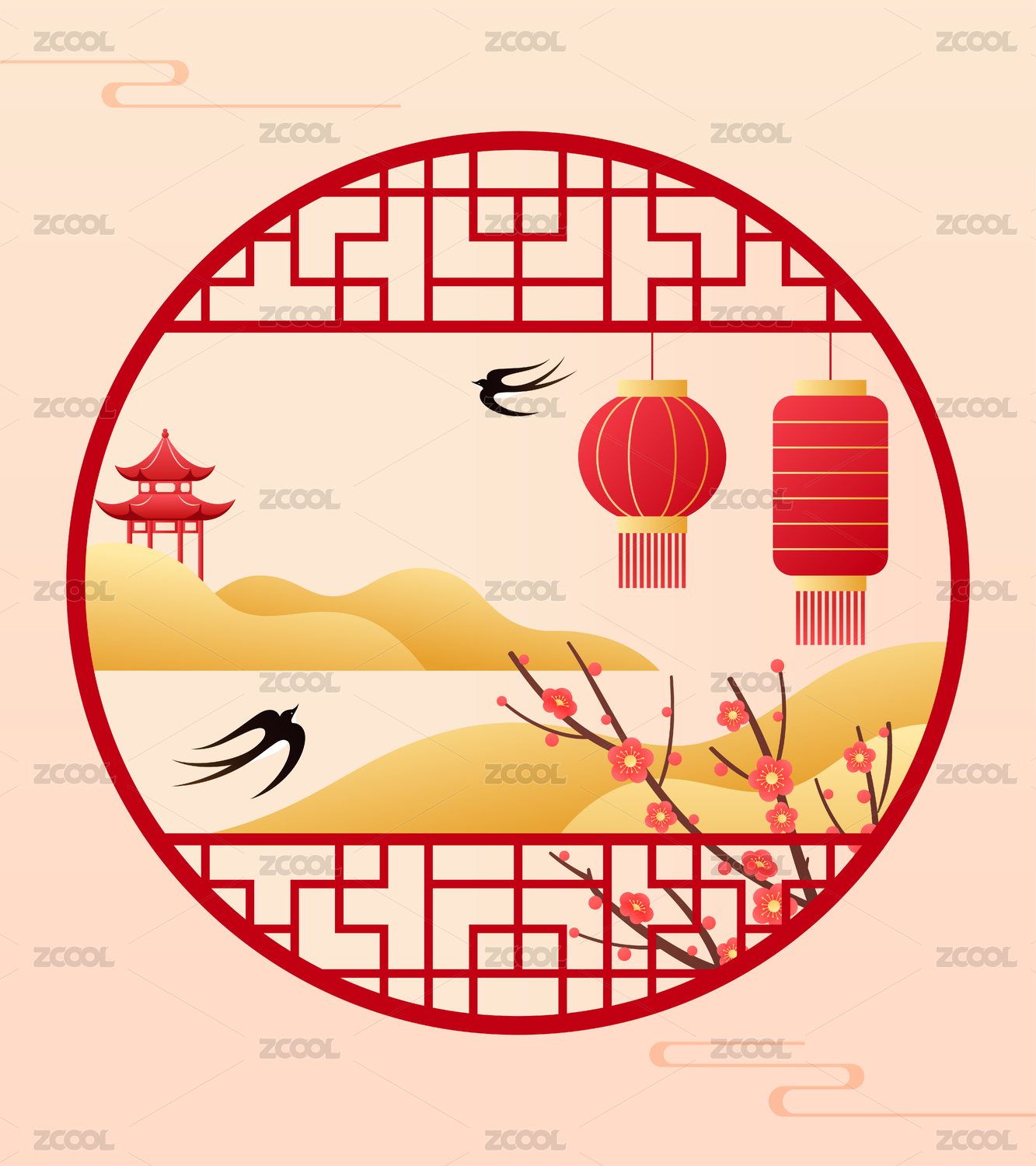 花窗灯笼和燕子等插画