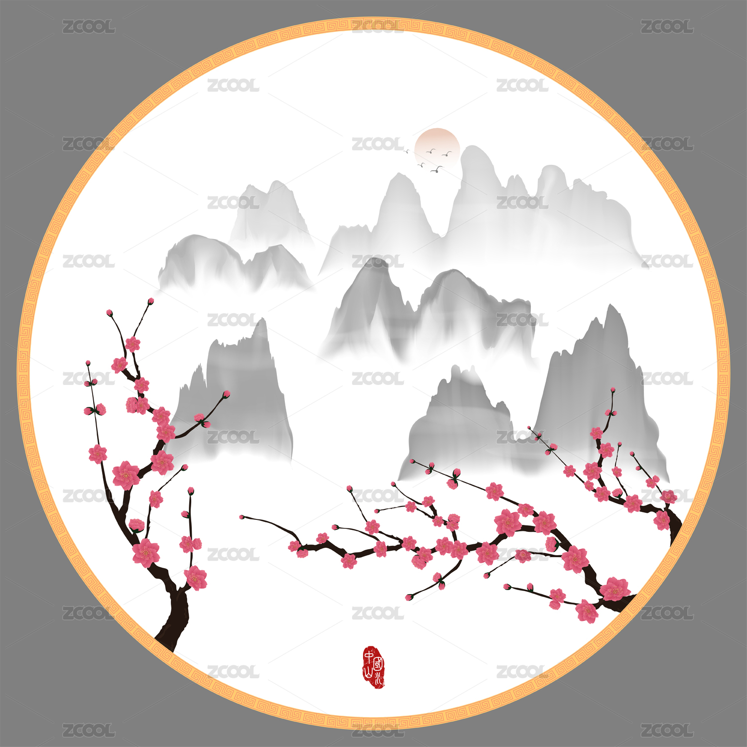 圆形梅花意境水墨山水装饰矢量分层背景图