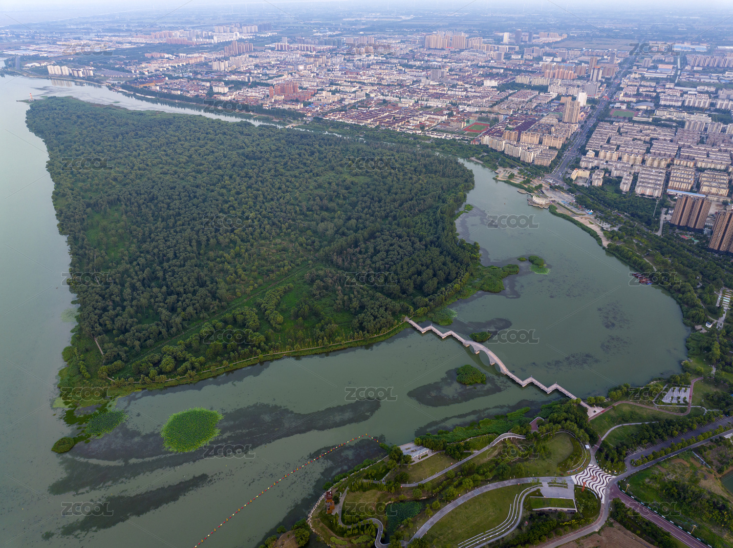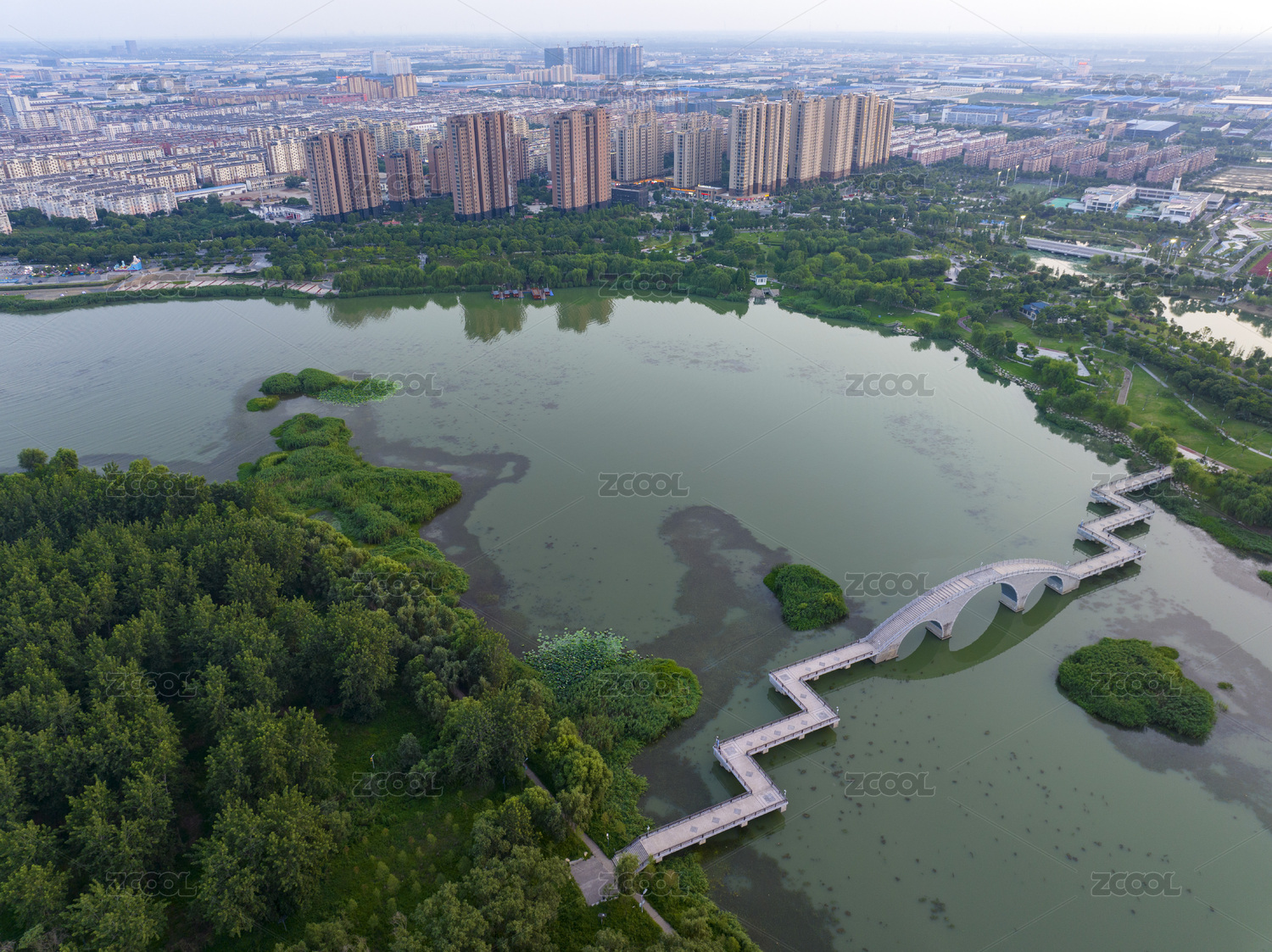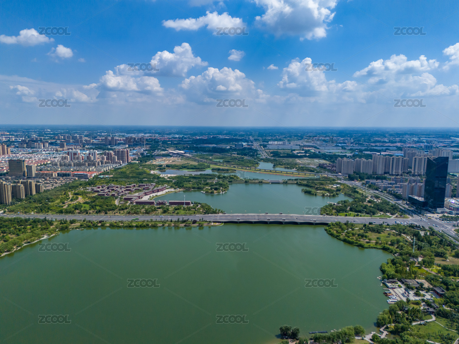 航拍河南郑州象湖生态湿地公园及贾鲁河水系