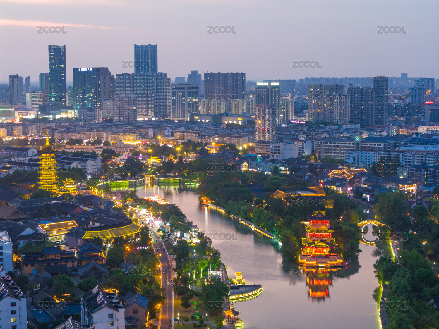 航拍淮安中洲岛清江浦御码头城市夜景