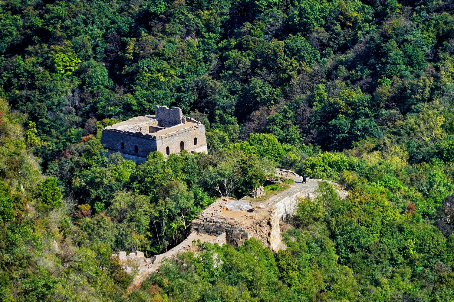 北京箭扣长城残垣断壁的敌楼航拍俯视图