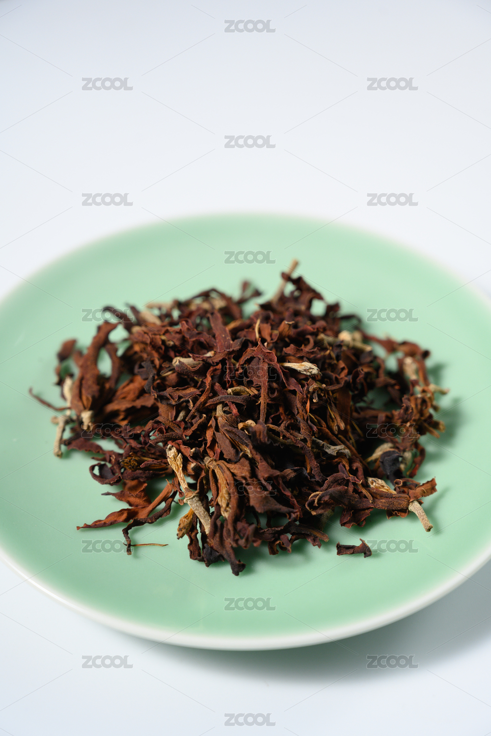 普洱茶生茶茶叶放在瓷盘里俯拍