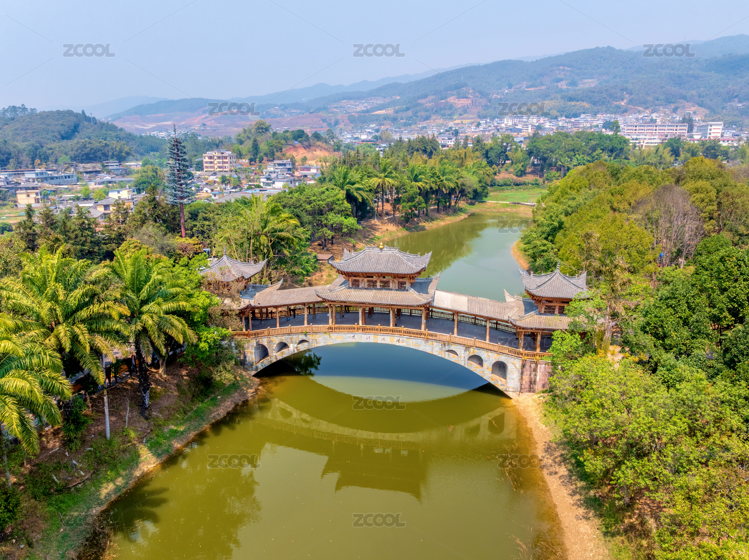 中国云南普洱澜沧县拉祜风情园小康桥航拍