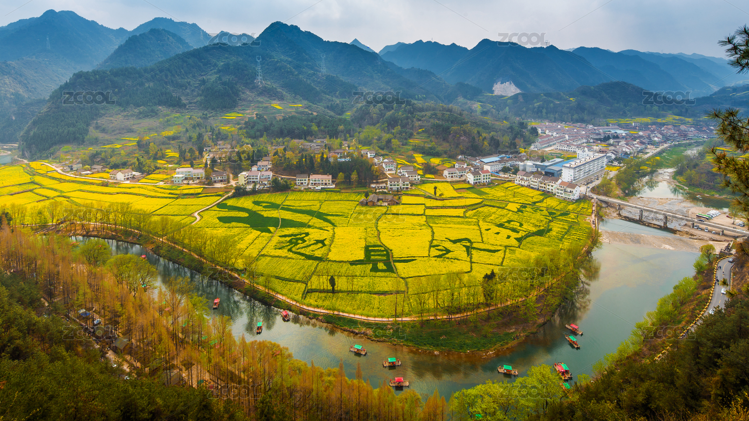 中国湖南娄底水洞底湾湾的孙水河和油菜花