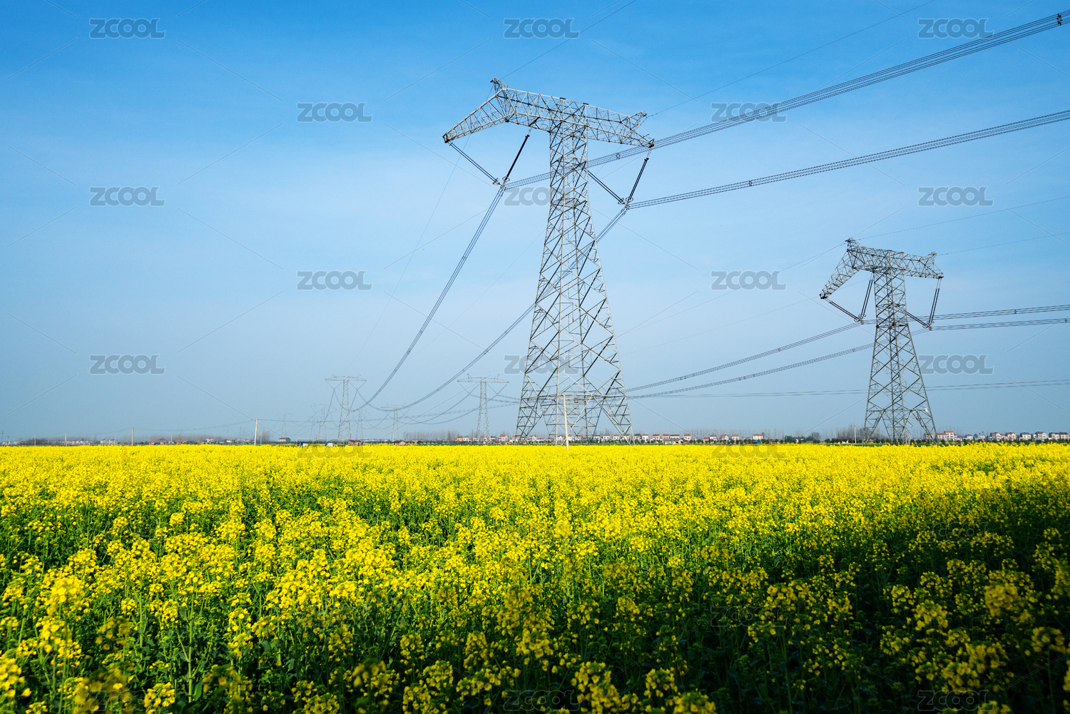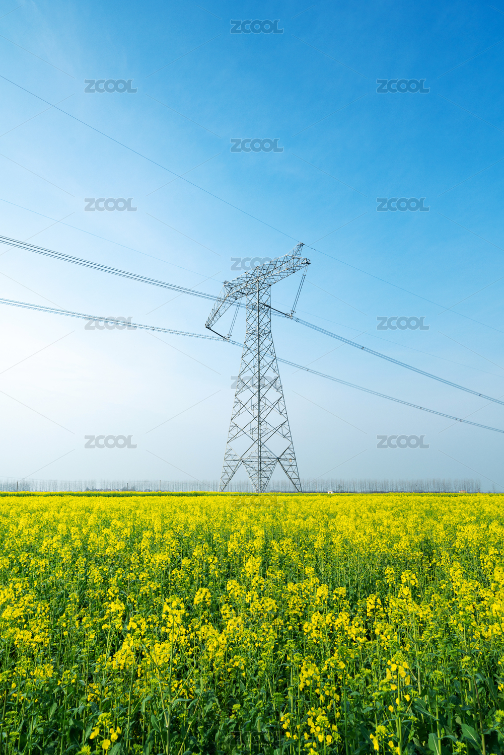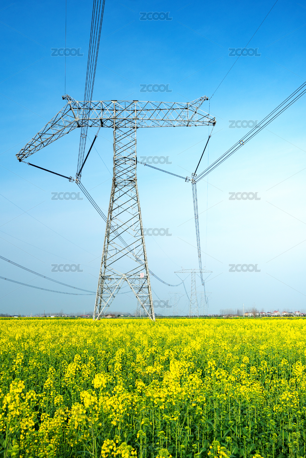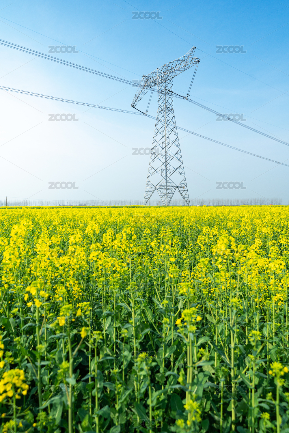蓝天白云下的油菜花田和高压电线杆