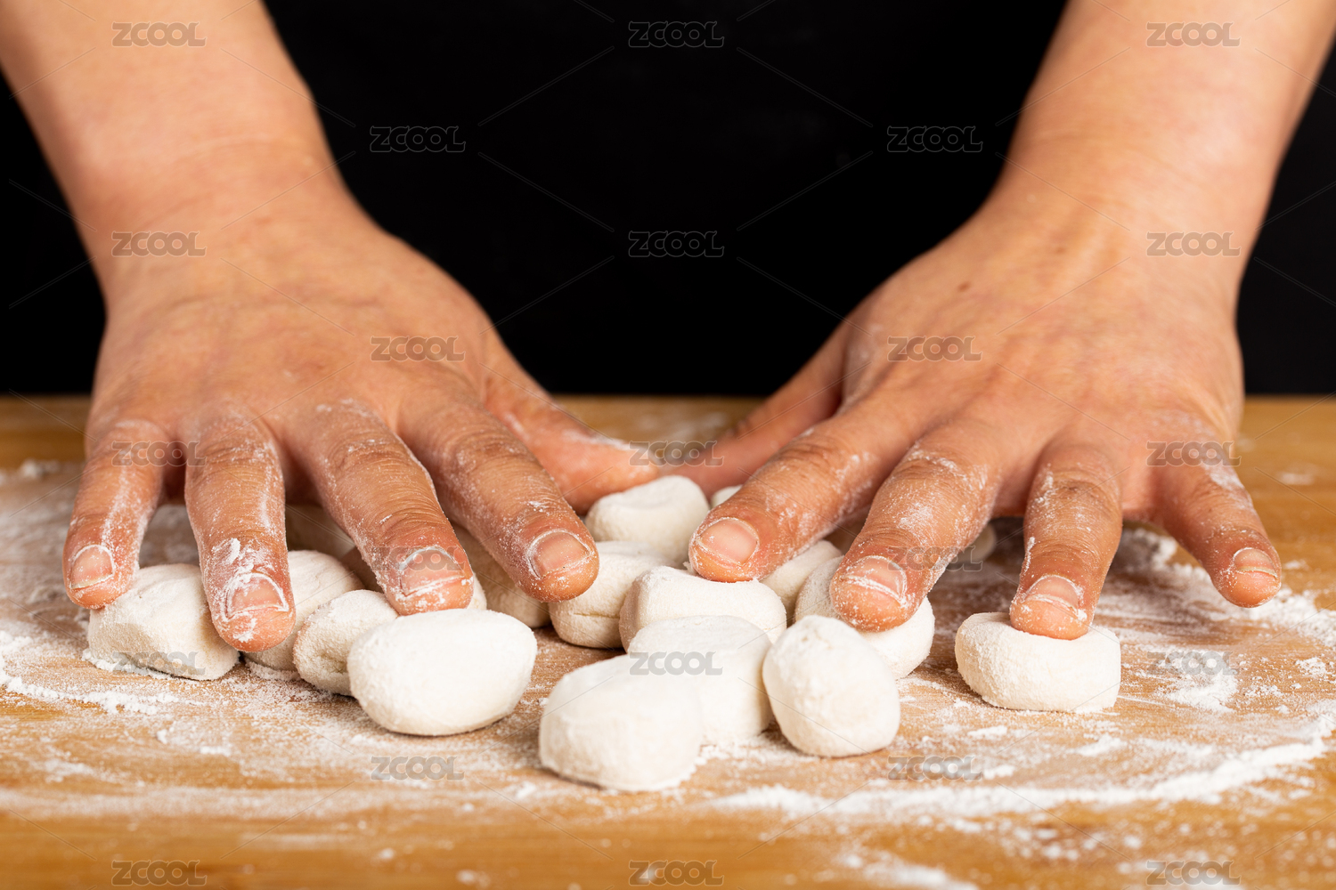 俯视拍摄面点师在使劲揉搓砧板上的面团
